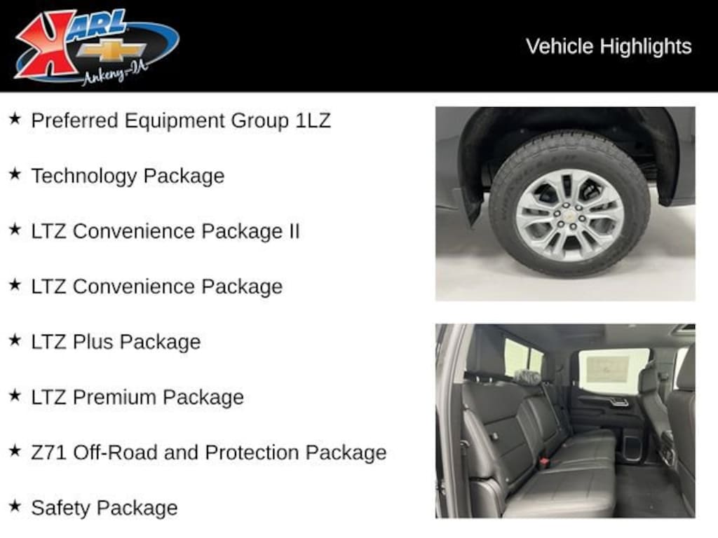 Elevate Your Driving Experience with the Exceptional 2026 Chevrolet Silverado 1500 LTZPrepare to be captivated by the unparalleled capabilities and refined luxury of the 2026 Chevrolet Silverado 1500 LTZ. This in-transit masterpiece is poised to redefine your expectations, blending power, technology, and style into a seamless driving experience.- Premium Bose 7-Speaker Sound System- Chevrolet Infotainment 3 Premium System- SiriusXM with 360L Trial Subscription- Heated Steering Wheel- Ventilated Driver and Front Passenger Seats- Power Sunroof- Power Tailgate- Integrated Trailer Brake ControllerBeneath the stunning Black exterior lies the heart of a true workhorse. The EcoTec3 5.3L V8 engine, paired with a 10-Speed Automatic transmission and 4WD, delivers exceptional performance and efficiency, with an EPA-estimated 15 city/20 highway MPG. The Silverado 1500 LTZ is ready to tackle any task, whether it's conquering the open road or navigating challenging terrain with the help of features like the Z71 Off-Road Package and Hill Descent Control.Elevate your driving experience with the advanced technology and premium amenities of the Silverado 1500 LTZ. Stay connected with the Chevrolet Infotainment 3 Premium System, complete with Apple CarPlay and Android Auto integration, as well as a 12.3 Multicolor Reconfigurable Digital Display and 15 Diagonal Multicolor Head-Up Display. Enjoy the convenience of Wireless Charging, the safety of Adaptive Cruise Control and Rear Cross Traffic Braking, and the peace of mind of the Theft Deterrent System.Comfort and convenience are paramount in the Silverado 1500 LTZ. Indulge in the luxurious Perforated Leather-Appointed Front Seat Trim, with heated and ventilated front seats and a heated steering wheel. The 10-way power driver and passenger seats with lumbar support ensure a tailored fit, while the split-folding rear seat and 120-volt power outlets provide versatility for all your needs.Experience the perfect blend of capability, technology, and refinement with the 2026 Chevrolet Silverado 1500 LTZ. This in-transit masterpiece is poised to elevate your driving experience and exceed your every expectation. Visit our showroom today to explore this exceptional vehicle and discover how it can transform your journey.At Karl Chevrolet we want to help you find the best new or used car in Ankeny that suits your needs. When you buy a new car at Karl Chevrolet you know you're finding a vehicle you can rely on. We have a great selection of Platinum Quality Pre-Owned Vehicles. We also pride ourselves in creating a friendly atmosphere and a reliable Dealership that you can trust. Call us and our experts will be glad to help you! (515) 299-4300. *Equipment and options are generated by a 3rd party vendor, exact vehicle options may vary. Please see a salesperson for complete details and vehicle information. Price includes: $1500 - Chevrolet Bonus Cash. Exp. 04/30/2026 $4250 - Chevrolet Consumer Cash Program. Exp. 04/30/2026