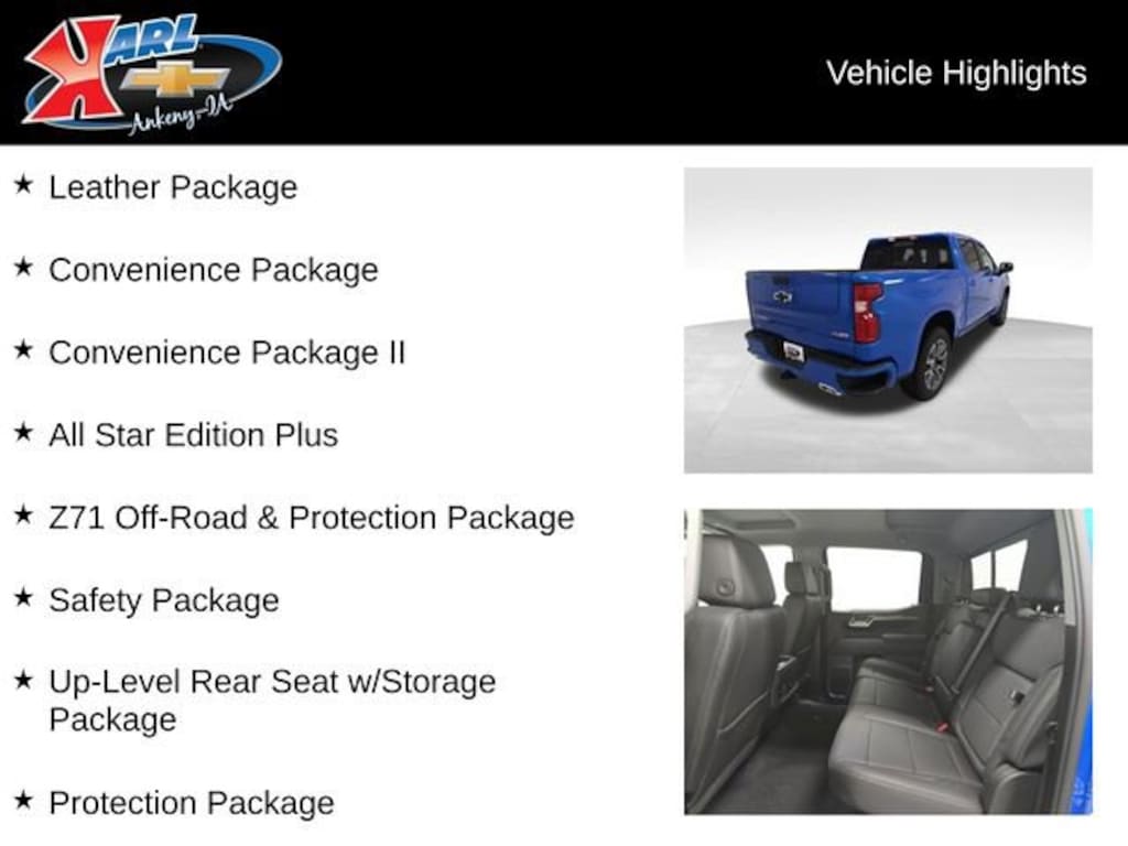 Factory MSRP: $66,375 10-Speed Automatic, 4WD, Black Leather, 10-Way Power Driver Seat w/Lumbar, 12.3 Multicolor Reconfigurable Digital Display, 120-Volt Bed Mounted Power Outlet, 120-Volt Interior Power Outlet, 2 USB Data Ports, 6-Speaker Audio System, All Star Edition Plus, All-Star Edition, All-Weather Floor Liner (LPO) (AAK), Apple CarPlay/Android Auto, Bumpers: body-color, Chevytec Spray-On Black Bedliner, Convenience Package, Convenience Package II, Dual Exhaust w/Polished Outlets, Dual Rear USB Ports (Charge Only), Dual-Zone Automatic Climate Control, Electric Rear-Window Defogger, Electronic Transmission Range Selector Shifter, Floor Mounted Center Console, Front Bucket Seats, Front LED Fog Lamps, HD Surround Vision, Heated Driver & Front Outboard Passenger Seats, Heated Power-Adjustable Outside Mirrors, Heated Steering Wheel, Heavy-Duty Air Filter, High Gloss Black Mirror Caps, Hill Descent Control, Hitch Guidance, Hitch Guidance w/Hitch View, In-Vehicle Trailering System App, Integrated Trailer Brake Controller, IntelliBeam Automatic High Beam On/Off, Keyless Open & Start, Leather Package, Leather-Appointed Front Seat Trim, LED Cargo Area Lighting, Manual Tilt/Telescoping Steering Column, Multi-Flex Tailgate, Off-Road Suspension, Perimeter Lighting, Power door mirrors, Power Sliding Rear Window w/Rear Defogger, Premium audio system: Chevrolet Infotainment 3 Premium, Premium Bose 7-Speaker Sound System, Protection Package, Radio: Chevrolet Infotainment 3 Premium System, Rear 60/40 Folding Bench Seat (Folds Up), Rear Cross Traffic Braking, Rear Pedestrian Alert, Rear Wheelhouse Liners, Remote Vehicle Starter System, Safety Package, Split folding rear seat, Standard Suspension Package, Theft Deterrent System (Unauthorized Entry), Trailer Camera Provisions, Trailer Side Blind Zone Alert, Trailering Package, Ultrasonic Front & Rear Park Assist, Universal Home Remote, Up-Level Rear Seat w/Storage Package, Wheels: 20 x 9 Painted Aluminum, Wireless Charging, Wrapped Steering Wheel, Z71 Off-Road & Protection Package, Z71 Off-Road Package.