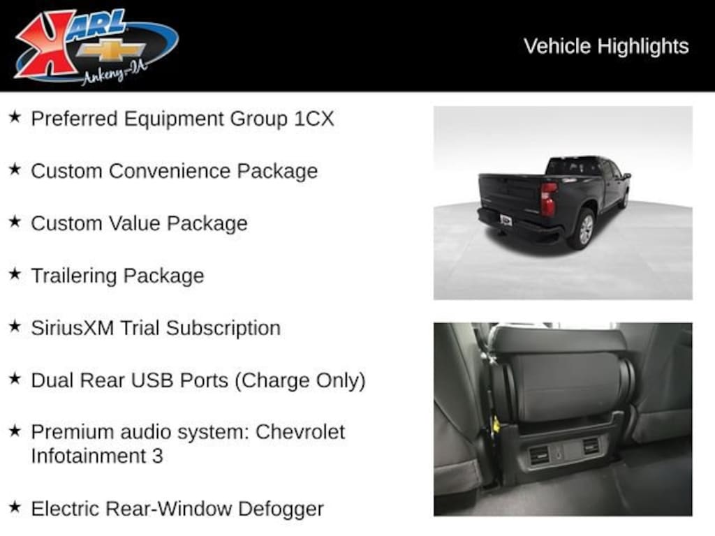 Factory MSRP: $50,030 $4,336 off MSRP! Priced below KBB Fair Purchase Price! 8-Speed Automatic, 4WD, Black Cloth, 10-Way Power Driver Seat w/Lumbar, 120-Volt Bed Mounted Power Outlet, 120-Volt Interior Power Outlet, 3.5 Monochromatic Display Driver Info Center, ABS brakes, Bluetooth® For Phone, Bumpers: body-color, Chevytec Spray-On Black Bedliner, Color-Keyed Carpeting Floor Covering, Custom Convenience Package, Custom Value Package, Deep-Tinted Glass, Driver vanity mirror, Dual front impact airbags, Dual Rear USB Ports (Charge Only), Electric Rear-Window Defogger, Electronic Cruise Control, Emergency communication system: OnStar, EZ Lift Power Lock & Release Tailgate, Following Distance Indicator, Forward Collision Alert, Front Frame-Mounted Black Recovery Hooks, Front Pedestrian Braking, Front Rubberized Vinyl Floor Mats, Front wheel independent suspension, HD Rear Vision Camera, Heated door mirrors, Hitch Guidance, LED Cargo Area Lighting, Manual Tilt Wheel Steering Column, OnStar Services Capable, Power Front Windows w/Driver Express Up/Down, Power Front Windows w/Passenger Express Down, Power Rear Windows w/Express Down, Preferred Equipment Group 1CX, Premium audio system: Chevrolet Infotainment 3, Rear 60/40 Folding Bench Seat (Folds Up), Rear Rubberized-Vinyl Floor Mats, Rear Wheelhouse Liners, Remote Keyless Entry, Remote Vehicle Starter System, SiriusXM Trial Subscription, Standard Tailgate, Teen Driver, Theft Deterrent System (Unauthorized Entry), Tire Pressure Monitoring System, Trailering Package, Variably intermittent wipers, Wheels: 20 x 9 Bright Silver Painted Aluminum, Wi-Fi Hot Spot Capable.