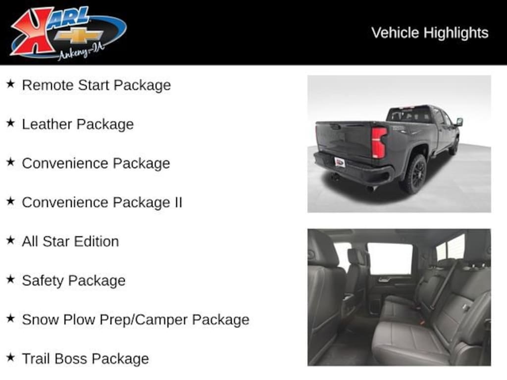 Factory MSRP: $78,685 $4,251 off MSRP! 10-Speed Automatic, 4WD, Jet Blk Lth-Appointed Fro Leather, 2 Charge/Data USB Ports Inside Center Console, 220 Amp Alternator, 4-Way Manual Driver Seat Adjuster, 6-Speaker Audio System, All Star Edition, AM/FM radio: SiriusXM with 360L, Animated LED Projector Headlamps, Auto-Dimming Inside Rear-View Mirror, Bluetooth® For Phone, Body-Color Front Bumper, Body-Color Rear Bumper, Chevrolet Connected Access Capable, Cloth Seat Trim, Color-Keyed Carpeting Floor Covering, Convenience Package, Convenience Package II, Dual front impact airbags, Dual front side impact airbags, Dual-Zone Automatic Climate Control, Durabed Pickup Bed, Electric Rear-Window Defogger, Electronic Stability Control, Floor-Mounted Center Console, Front anti-roll bar, Front Bucket Seats, Front Center Armrest w/Storage, Front Frame-Mounted Red Recovery Hooks, Front LED Fog Lamps, Front reading lights, Front Rubberized Vinyl Floor Mats, Gooseneck/5th Wheel Prep Package, Halogen Reflector Headlamps, HD Surround Vision, Heat Package, Heated Steering Wheel, High Gloss Black Door Handles, High Gloss Black Front Bumper, High Gloss Black Mirror Caps, High Gloss Black Rear Bumper, Hill Descent Control, Leather Package, LED Cargo Area Lighting, Low tire pressure warning, Off-Road Suspension, OnStar Services Capable, Outside temperature display, Overhead airbag, Power steering, Power windows, Push Button Start, Radio: Chevrolet Infotainment 3 Premium System, Rear Cross Traffic Alert, Remote Start Package, Remote Vehicle Starter System, Safety Package, Snow Plow Prep/Camper Package, Standard Tailgate, Suspension Package, Trail Boss Package, Trailer Camera Provisions, Trailer Side Blind Zone Alert, Unauthorized Entry Theft-Deterrent System, Universal Home Remote, Wheels: 20 High Gloss Black Painted, Wi-Fi Hotspot Capable, Wireless Charging, Wireless Phone Projection, Z71 Off-Road Package.