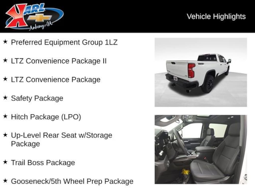 Factory MSRP: $84,750 $2,000 off MSRP! 10-Speed Automatic, 4WD, Black Leather, 10-Way Power Driver Seat Adjuster w/Lumbar, 10-Way Power Passenger Seat Adjuster w/Lumbar, 120-Volt Bed Mounted Power Outlet, 120-Volt Interior Power Outlet, 170 Amp Alternator, 2 Charge/Data USB Ports Inside Center Console, 6-Speaker Audio System, Adaptive Cruise Control, Apple CarPlay/Android Auto, Auto-Dimming Inside Rear-View Mirror, Bed View Camera w/2 Trailer Camera Provisions, Black Chevytec Spray-On Bedliner, Black Grille Bar w/Chevy Black Bow Tie, Bluetooth® For Phone, BOSE Premium 7-Speaker Sound System, Bumpers: chrome, Chevrolet Connected Access Capable, Chrome Door Handles, Chrome Mirror Caps, Color-Keyed Carpeting Floor Covering, Compass, Deep-Tinted Glass, Electric Rear-Window Defogger, Electronic Cruise Control w/Set & Resume Speed, EZ Lift Power Lock & Release Tailgate, Floor-Mounted Center Console, Front Bucket Seats, Front Frame-Mounted Red Recovery Hooks, Front LED Fog Lamps, Front License Plate Kit, Front Rain-Sensing Wipers, Front Rubberized Vinyl Floor Mats, Gooseneck/5th Wheel Prep Package, HD Rear Vision Camera, HD Surround Vision, Heated 2nd Row Outboard Seats, Heated door mirrors, Heated Driver & Front Outboard Passenger Seating, Heated Steering Wheel, High Gloss Black Door Handles, High Gloss Black Front Bumper, High Gloss Black Mirror Caps, High Gloss Black Rear Bumper, Hill Descent Control, Hitch Guidance w/Hitch View, Hitch Package (LPO), In-Vehicle Trailering App System, Keyless Open & Start, LED Cargo Area Lighting, LED Smoked Amber Roof Marker Lamps, LTZ Convenience Package, LTZ Convenience Package II, Manual Tilt & Telescoping Steering Column, Off-Road Suspension, OnStar Services Capable, Perf Leather-Appointed Front Outboard Seat Trim, Power Door Locks, Power door mirrors, Power Front Windows w/Driver Express Up/Down, Power Front Windows w/Passenger Express Up/Down, Power passenger seat, Power Rear Windows w/Express Down, Power Sliding Rear Window w/Defogger, Power Sunroof, Preferred Equipment Group 1LZ, Premium audio system: Chevrolet Infotainment 3 Premium, Push Button Start, Radio: Chevrolet Infotainment 3 Premium System, Rear Cross Traffic Alert, Rear Rubberized Vinyl Floor Mats, Rear Wheelhouse Liners, Remote Vehicle Starter System, Safety Alert Seat, Safety Package, SiriusXM w/360L Trial Subscription, Split folding rear seat, Standard Tailgate, Steering Wheel Audio Controls, Suspension Package, Trail Boss Package, Trailer Camera Provisions, Trailer Side Blind Zone Alert, Ultrasonic Front & Rear Park Assist, Unauthorized Entry Theft-Deterrent System, Universal Home Remote, Up-Level Rear Seat w/Storage Package, Ventilated Driver & Front Passenger Seats, Wheels: 20 High Gloss Black Painted, Wi-Fi Hotspot Capable, Wireless Charging, Wireless Phone Projection, Wrapped Steering Wheel, Z71 Off-Road Package.Recent Arrival!Summit White 2026 Chevrolet Silverado 2500HD LTZ 4WD CREW 159 4D Crew Cab Duramax 6.6L V8 Turbodiesel 10-Speed Automatic 4WD Price includes: $1000 - Chevrolet Consumer Cash Program. Exp. 11/03/2025