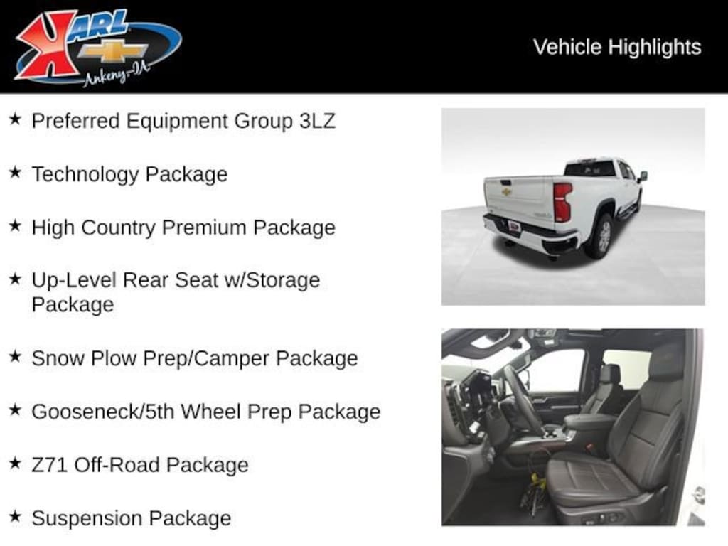 Factory MSRP: $89,104 $5,085 off MSRP! 10-Speed Automatic, 4WD, Jet Blk Perforated Lth Leather, 120-Volt Bed Mounted Power Outlet, 120-Volt Interior Power Outlet, 15 Diagonal Multicolor Head-Up Display, 170 Amp Alternator, 220 Amp Alternator, 3 Years SiriusXM, 6 Rectangular Chromed Tubular Assist Steps, Apple CarPlay/Android Auto, Auto-Dimming Inside Rear-View Mirror, Bluetooth® For Phone, Bodyside moldings, BOSE Premium 7-Speaker Sound System, Bumpers: body-color, Chevrolet Connected Access Capable, Chrome Door Handles, Chrome Mirror Caps, Color-Keyed Carpeting Floor Covering, Compass, Deep-Tinted Glass, Electric Rear-Window Defogger, Front Bucket Seats, Front Carpeted Floor Mats, Front Center Armrest, Front Chrome Recovery Hooks, Front LED Fog Lamps, Front Rain-Sensing Wipers, Gooseneck/5th Wheel Prep Package, Heated 2nd Row Outboard Seats, Heated door mirrors, Heated rear seats, Heated Steering Wheel, High Country Premium Package, Hill Descent Control, LED Cargo Area Lighting, LED Smoked Amber Roof Marker Lamps, Multi-Flex Tailgate, Off-Road Suspension, OnStar Services Capable, Perforated Leather Seat Trim, Polished Exhaust Tip, Power Door Locks, Power passenger seat, Power Sunroof, Preferred Equipment Group 3LZ, Premium audio system: Chevrolet Infotainment 3 Premium, Push Button Start, Radio: Chevrolet Infotainment 3 Premium System, Rear Camera Mirror, Rear Carpeted Floor Mats, Rear Cross Traffic Alert, Rear Wheelhouse Liners, Remote Vehicle Starter System, Snow Plow Prep/Camper Package, Split folding rear seat, Standard Tailgate, Steering Wheel Audio Controls, Suspension Package, Technology Package, Trailer Camera Provisions, Unauthorized Entry Theft-Deterrent System, Universal Home Remote, Wheels: 20 8-Spoke Bright Finish Aluminum, Wi-Fi Hotspot Capable, Wireless Charging, Wireless Phone Projection, Wrapped Steering Wheel, Z71 Off-Road Package.