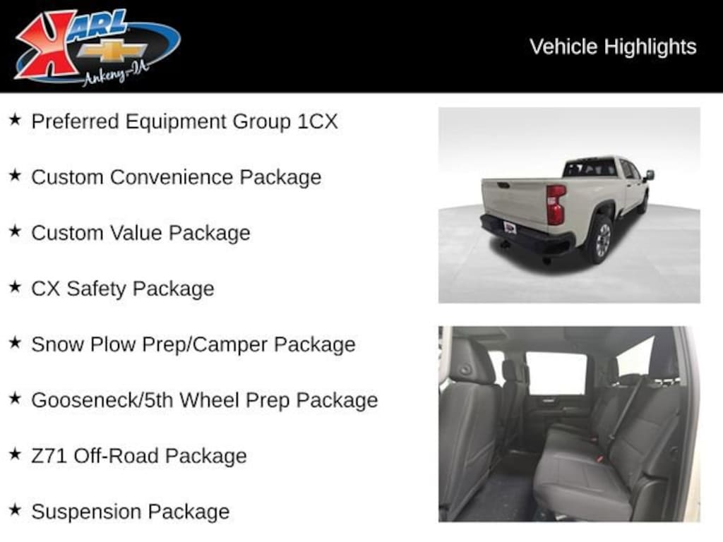 At Karl Chevrolet, we want to help you find the best new or used car in Ankeny that suits your needs. When you buy a new car at Karl Chevrolet, you know you're finding a vehicle you can rely on. We have a great selection of Platinum Quality Pre-Owned Vehicles. We also pride ourselves in creating a friendly atmosphere and a reliable Dealership that you can trust. Call us and our experts will be glad to help you! (515) 299-4300. *Equipment and options are generated by a 3rd party vendor, exact vehicle options may vary. Please see a salesperson for complete details and vehicle information. Price includes: $500 - Chevrolet Consumer Cash Program. Exp. 03/31/2026