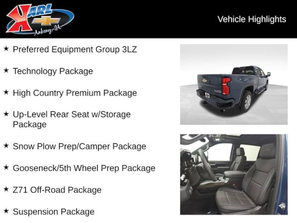 Factory MSRP: $89,104 $6,085 off MSRP! 10-Speed Automatic, 4WD, Jet Blk Perforated Lth Leather, 120-Volt Bed Mounted Power Outlet, 120-Volt Interior Power Outlet, 15 Diagonal Multicolor Head-Up Display, 170 Amp Alternator, 220 Amp Alternator, 6 Rectangular Chromed Tubular Assist Steps, Auto-Dimming Inside Rear-View Mirror, Bluetooth® For Phone, Bodyside moldings, BOSE Premium 7-Speaker Sound System, Bumpers: body-color, Chevrolet Connected Access Capable, Chrome Door Handles, Chrome Mirror Caps, Color-Keyed Carpeting Floor Covering, Compass, Deep-Tinted Glass, Electric Rear-Window Defogger, Front Bucket Seats, Front Carpeted Floor Mats, Front Center Armrest, Front Chrome Recovery Hooks, Front LED Fog Lamps, Front Rain-Sensing Wipers, Gooseneck/5th Wheel Prep Package, Heated 2nd Row Outboard Seats, Heated door mirrors, Heated rear seats, Heated Steering Wheel, High Country Premium Package, Hill Descent Control, LED Cargo Area Lighting, LED Smoked Amber Roof Marker Lamps, Multi-Flex Tailgate, Off-Road Suspension, OnStar Services Capable, Perforated Leather Seat Trim, Polished Exhaust Tip, Power Door Locks, Power door mirrors, Power passenger seat, Power Sunroof, Preferred Equipment Group 3LZ, Premium audio system: Chevrolet Infotainment 3 Premium, Push Button Start, Radio: Chevrolet Infotainment 3 Premium System, Rear Camera Mirror, Rear Carpeted Floor Mats, Rear Cross Traffic Alert, Rear Wheelhouse Liners, Remote Vehicle Starter System, Snow Plow Prep/Camper Package, Split folding rear seat, Standard Tailgate, Steering Wheel Audio Controls, Suspension Package, Technology Package, Trailer Camera Provisions, Unauthorized Entry Theft-Deterrent System, Universal Home Remote, Wheels: 20 8-Spoke Bright Finish Aluminum, Wi-Fi Hotspot Capable, Wireless Charging, Wireless Phone Projection, Wrapped Steering Wheel, Z71 Off-Road Package.