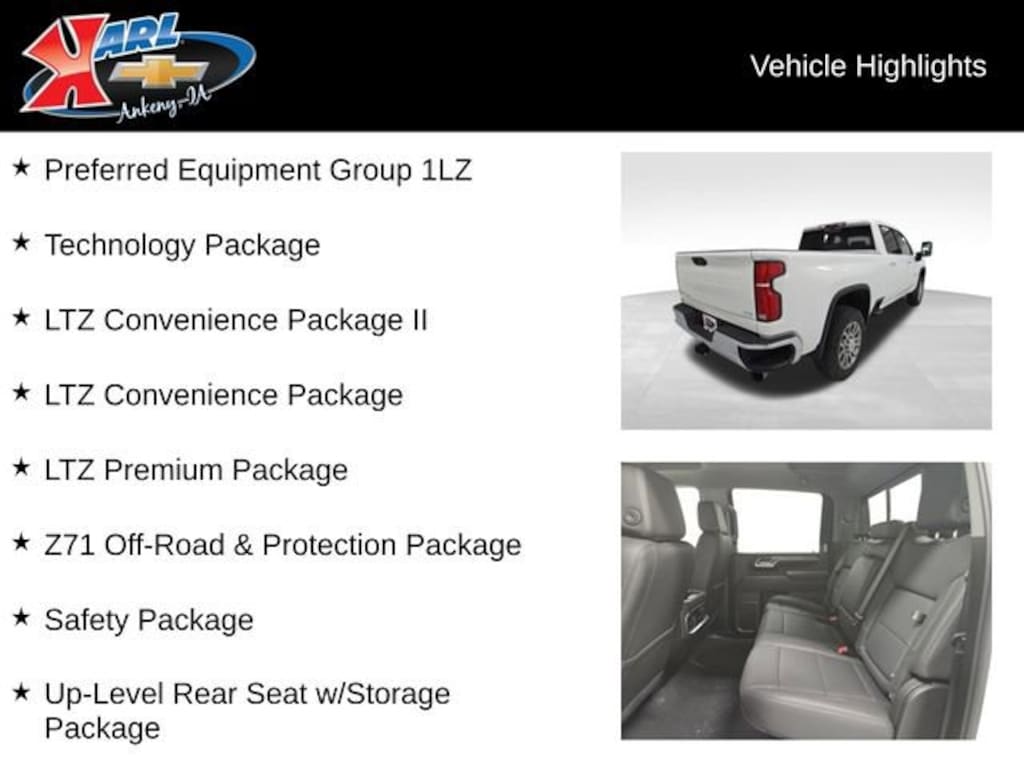 Factory MSRP: $80,855 $2,000 off MSRP! 10-Speed Automatic, 4WD, Jet Blk Perforated Lth-Ap Leather, 120-Volt Bed Mounted Power Outlet, 120-Volt Interior Power Outlet, 15 Diagonal Multicolor Head-Up Display, 170 Amp Alternator, 2 Charge/Data USB Ports Inside Center Console, 220 Amp Alternator, 6-Speaker Audio System, Adaptive Cruise Control, Apple CarPlay/Android Auto, Auto-Dimming Inside Rear-View Mirror, Bluetooth® For Phone, BOSE Premium 7-Speaker Sound System, Chevrolet Connected Access Capable, Chrome Door Handles, Chrome Mirror Caps, Color-Keyed Carpeting Floor Covering, Compass, Deep-Tinted Glass, Electric Rear-Window Defogger, Floor-Mounted Center Console, Front Bucket Seats, Front LED Fog Lamps, Front Rain-Sensing Wipers, Front Rubberized Vinyl Floor Mats, HD Rear Vision Camera, HD Surround Vision, Heated 2nd Row Outboard Seats, Heated door mirrors, Heated Steering Wheel, Hill Descent Control, LED Cargo Area Lighting, LED Smoked Amber Roof Marker Lamps, LTZ Convenience Package, LTZ Convenience Package II, LTZ Premium Package, Off-Road Suspension, OnStar Services Capable, Power Door Locks, Power door mirrors, Power passenger seat, Preferred Equipment Group 1LZ, Premium audio system: Chevrolet Infotainment 3 Premium, Push Button Start, Radio: Chevrolet Infotainment 3 Premium System, Rear Camera Mirror, Rear Cross Traffic Alert, Rear Rubberized Vinyl Floor Mats, Rear Wheelhouse Liners, Remote Vehicle Starter System, Safety Alert Seat, Safety Package, Snow Plow Prep/Camper Package, Split folding rear seat, Standard Tailgate, Steering Wheel Audio Controls, Suspension Package, Technology Package, Trailer Camera Provisions, Trailer Side Blind Zone Alert, Unauthorized Entry Theft-Deterrent System, Universal Home Remote, Wi-Fi Hotspot Capable, Wireless Charging, Wireless Phone Projection, Wrapped Steering Wheel, Z71 Off-Road Package.