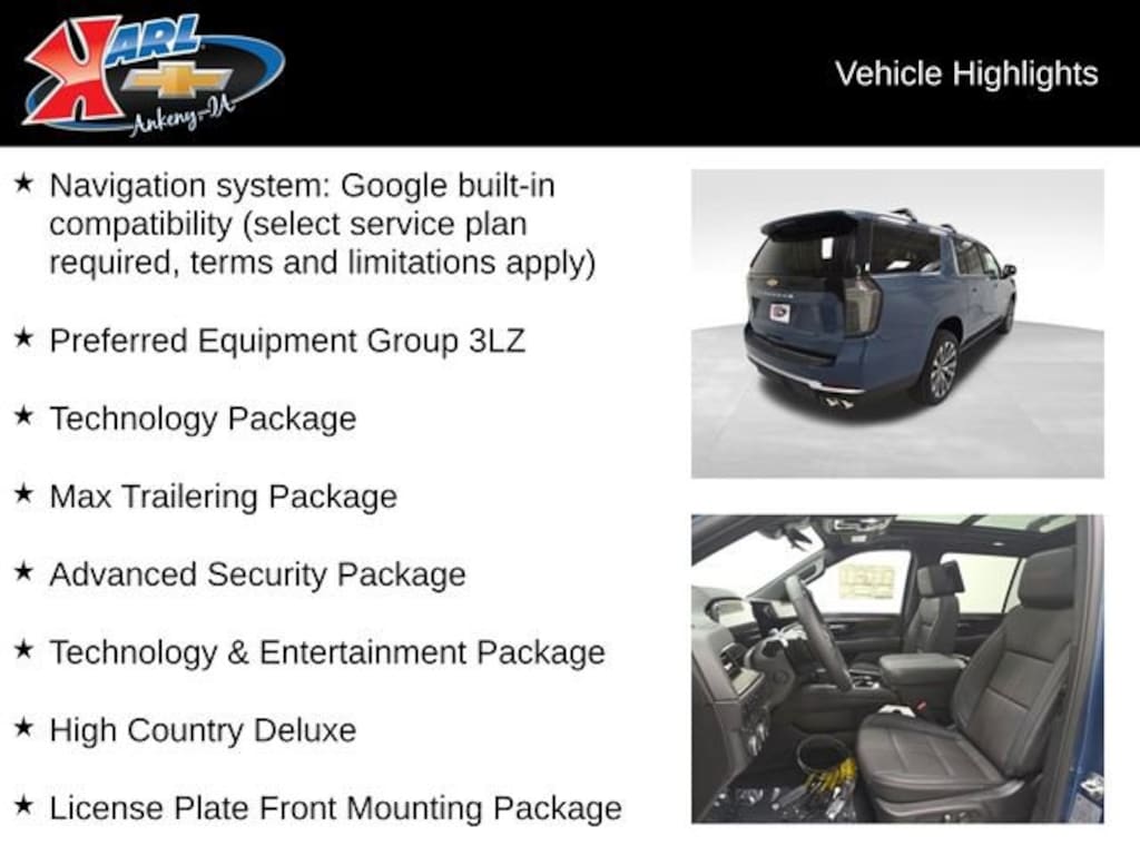 Factory MSRP: $99,699 $1,000 off MSRP! 15 Diagonal Multi-Color Head-Up Display, 2-Speed Active Electronic AutoTrac Transfer Case, 3rd Row 60/40 Power-Folding Split-Bench, 3rd row seats: split-bench, 4-Way Power Driver Lumbar Seat Adjuster, 4-Way Power Front Passenger Lumbar Seat Adjuster, 8-Way Power Front Passenger Seat Adjuster, Advanced Security Package, Advanced Trailering Package, Air Ride Adaptive Suspension, Apple CarPlay/Android Auto, AutoSense Hands-Free Power Liftgate, Dual Exhaust System, Dual-Pane Power Panoramic Sunroof, Extra Capacity Cooling System, Front Bucket Seats, Front Center Armrest, Front LED Fog Lamps, Glass Breakage Sensor, Heated 2nd Row Outboard Seats, Heated front seats, Heated Power-Adjustable Outside Mirrors, Heated rear seats, Heated Steering Wheel, High Country Deluxe, Hill Descent Control, Integrated Trailer Brake Controller, Interior Camera, LED Tail Lamps, License Plate Front Mounting Package, Max Trailering Package, Memory Settings, Navigation system: Google built-in compatibility (select service plan required, terms and limitations apply), Perforated Leather Seating Surfaces, Power Liftgate, Power passenger seat, Power Release 2nd Row Bucket Seats, Power-Retractable Assist Steps, Power-Sliding Center Floor Console, Preferred Equipment Group 3LZ, Radio: 17.7 Diagonal Advanced Color LCD Display, Rear Power Liftgate, Rear Seat Media System, Self-Powered Horn Theft-Deterrent Alarm System, Smart Trailer Integration Indicator, Split folding rear seat, Technology & Entertainment Package, Technology Package, Universal Home Remote, Vehicle Inclination Sensor, Vehicle Interior Movement Sensor, Ventilated front seats, Wireless Apple CarPlay/Wireless Android Auto, Wireless Phone Charging.