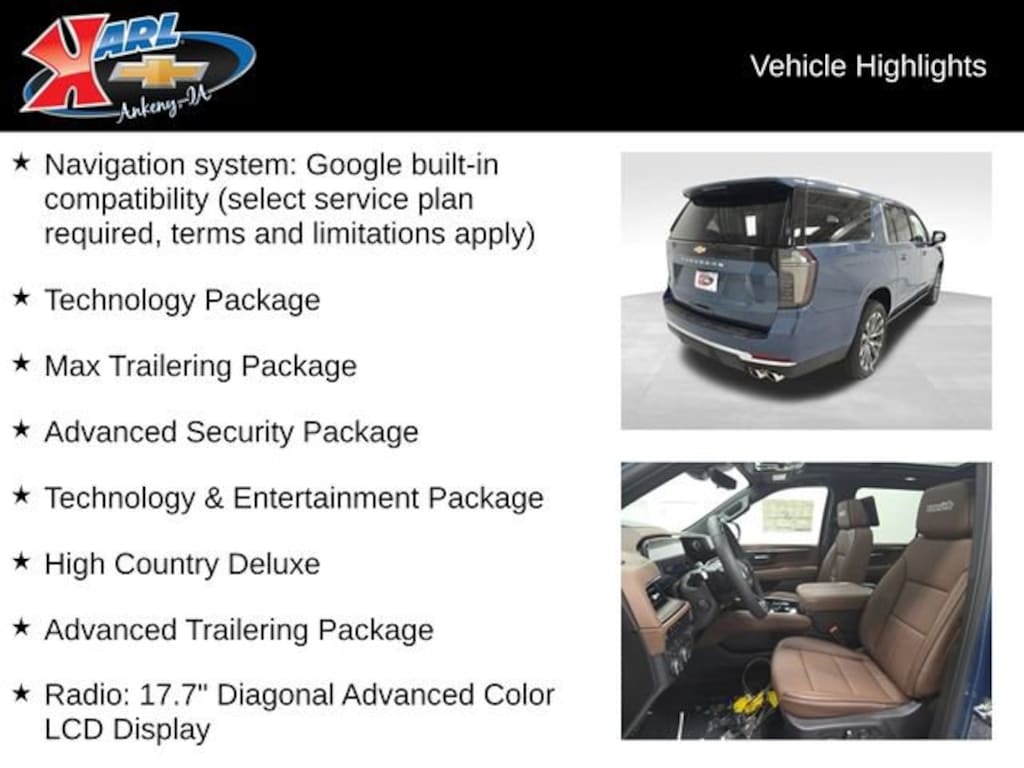 Factory MSRP: $98,375 $4,684 off MSRP! 15 Diagonal Multi-Color Head-Up Display, 2-Speed Active Electronic AutoTrac Transfer Case, 3rd Row 60/40 Power-Folding Split-Bench, 3rd row seats: split-bench, 4-Way Power Front Passenger Lumbar Seat Adjuster, Advanced Security Package, Advanced Trailering Package, Air Ride Adaptive Suspension, Apple CarPlay/Android Auto, AutoSense Hands-Free Power Liftgate, Dual-Pane Power Panoramic Sunroof, Extra Capacity Cooling System, Front Bucket Seats, Front Center Armrest, Glass Breakage Sensor, Heated 2nd Row Outboard Seats, Heated rear seats, High Country Deluxe, Hill Descent Control, Integrated Trailer Brake Controller, Max Trailering Package, Navigation system: Google built-in compatibility (select service plan required, terms and limitations apply), Perforated Leather Seating Surfaces, Power Liftgate, Power passenger seat, Power Release 2nd Row Bucket Seats, Power-Retractable Assist Steps, Power-Sliding Center Floor Console, Radio: 17.7 Diagonal Advanced Color LCD Display, Rear Seat Media System, Self-Powered Horn Theft-Deterrent Alarm System, Smart Trailer Integration Indicator, Split folding rear seat, Technology & Entertainment Package, Technology Package, Vehicle Inclination Sensor, Vehicle Interior Movement Sensor, Ventilated front seats, Wireless Apple CarPlay/Wireless Android Auto.