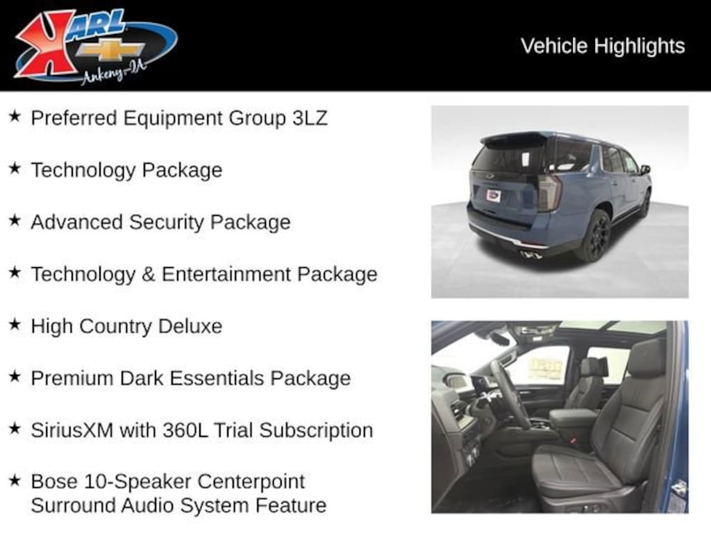 At Karl Chevrolet we want to help you find the best new or used car in Ankeny that suits your needs. When you buy a new car at Karl Chevrolet you know you're finding a vehicle you can rely on. We have a great selection of Platinum Quality Pre-Owned Vehicles. We also pride ourselves in creating a friendly atmosphere and a reliable Dealership that you can trust. Call us and our experts will be glad to help you! (515) 299-4300. *Equipment and options are generated by a 3rd party vendor, exact vehicle options may vary. Please see a salesperson for complete details and vehicle information.