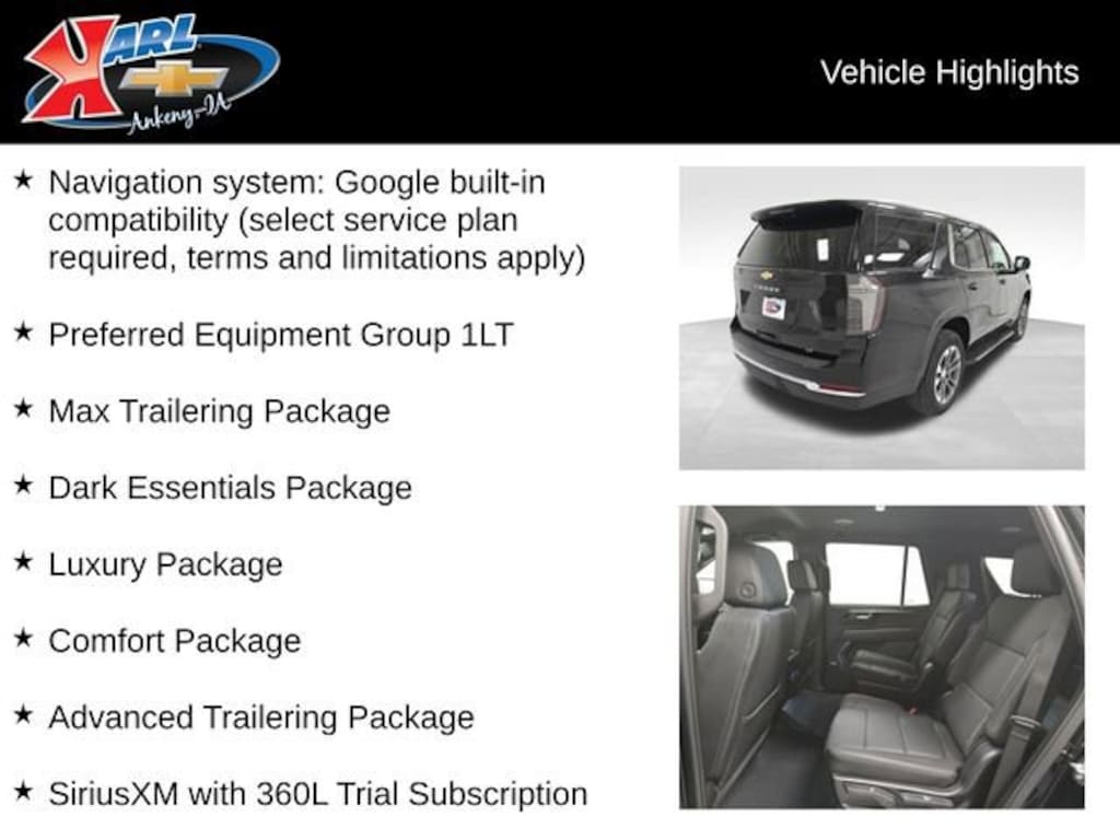 At Karl Chevrolet we want to help you find the best new or used car in Ankeny that suits your needs. When you buy a new car at Karl Chevrolet you know you're finding a vehicle you can rely on. We have a great selection of Platinum Quality Pre-Owned Vehicles. We also pride ourselves in creating a friendly atmosphere and a reliable Dealership that you can trust. Call us and our experts will be glad to help you! (515) 299-4300. *Equipment and options are generated by a 3rd party vendor, exact vehicle options may vary. Please see a salesperson for complete details and vehicle information.