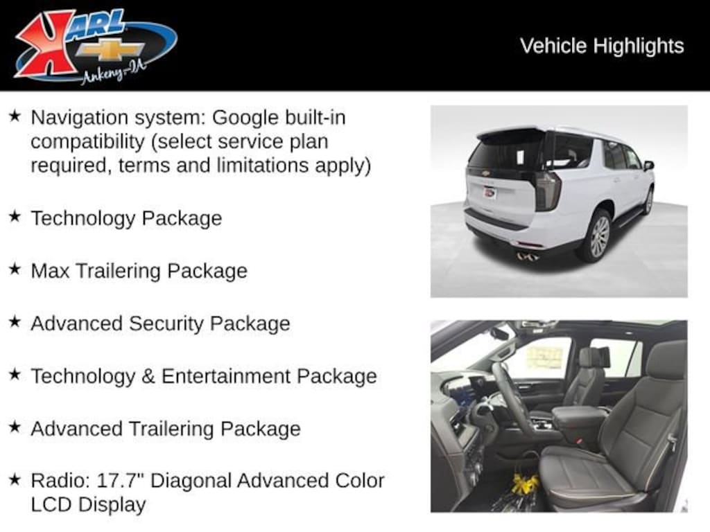 Factory MSRP: $92,079 $6,919 off MSRP! 4WD, Black Leather, 15 Diagonal Multi-Color Head-Up Display, 2-Speed Active Electronic AutoTrac Transfer Case, 20 x 9 Polished Aluminum Wheels, 3-Spoke Wrapped Steering Wheel, 3rd Row 60/40 Power-Folding Split-Bench Seat, 3rd row seats: split-bench, 4-Way Power Front Passenger Lumbar Seat Adjuster, 8-Way Power Driver Seat Adjuster, 8-Way Power Front Passenger Seat Adjuster, Adaptive suspension, Advanced Security Package, Advanced Trailering Package, Air Conditioning, Auto-Dimming Inside Rear-View Mirror, Automatic temperature control, AutoSense Hands-Free Power Liftgate, Brake assist, Chrome Mirror Caps, Compass, Dual Exhaust System, Dual front impact airbags, Dual front side impact airbags, Dual-Pane Power Panoramic Sunroof, Electronic Stability Control, Exterior Parking Camera Rear, Floor Console, Four wheel independent suspension, Front anti-roll bar, Front Bucket Seats, Front Center Armrest, Front dual zone A/C, Front LED Fog Lamps, Garage door transmitter, Glass Breakage Sensor, Heated 2nd Row Outboard Seats, Heated rear seats, Heated steering wheel, Hill Descent Control, Integrated Trailer Brake Controller, Key Card, Magnetic Ride Control Suspension, Max Trailering Package, Memory Settings, Navigation system: Google built-in compatibility (select service plan required, terms and limitations apply), Occupant sensing airbag, Outside Heated Power-Adjustable Mirrors, Outside temperature display, Overhead airbag, Overhead console, Perforated Leather Seat Trim, Power driver seat, Power Liftgate, Power passenger seat, Power Release 2nd Row Bucket Seats, Power windows, Premium audio system: Chevrolet Infotainment 3 Premium, Radio: 17.7 Diagonal Advanced Color LCD Display, Rain sensing wipers, Rear air conditioning, Rear Power Liftgate, Rear Seat Media System, Rear window defroster, Rear window wiper, Remote keyless entry, Security system, Smart Trailer Integration Indicator, Split folding rear seat, Spoiler, Super Cruise, Technology & Entertainment Package, Technology Package, Telescoping steering wheel, Theft-Deterrent Alarm System, Trip computer, Universal Home Remote, Variably intermittent wipers, Vehicle Inclination Sensor, Vehicle Interior Movement Sensor, Ventilated front seats, Wheels: 22 x 9 Manoogian Silver Painted Aluminum, Wireless Phone Charging.