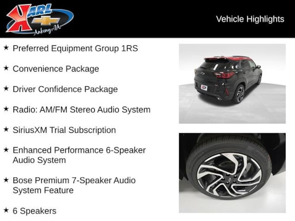 Factory MSRP: $32,375 $3,000 off MSRP! 29/33 City/Highway MPG 120-Volt Power Outlet, 2-Way Power Driver Lumbar Seat Adjuster, 4-Way Manual Front Passenger Seat Adjuster, 6 Speakers, Adaptive Cruise Control, Air Conditioning, AM/FM radio: SiriusXM, Bose Premium 7-Speaker Audio System Feature, Brake assist, Cabin Humidity Sensor, Convenience Package, Driver Confidence Package, Driver door bin, Driver vanity mirror, Dual front impact airbags, Electronic Stability Control, Emergency communication system: OnStar and Chevrolet connected services capable, Enhanced Performance 6-Speaker Audio System, Evotex Seat Trim, Exterior Parking Camera Rear, Flat-Folding Front Passenger Seatback, Front Center Armrest, Front License Plate Bracket, Front reading lights, Hands Free Power Programmable Liftgate, Heated door mirrors, Heated front seats, Heated steering wheel, Inside Rear-View Auto-Dimming Mirror, Low tire pressure warning, Overhead airbag, Power door mirrors, Power driver seat, Power windows, Preferred Equipment Group 1RS, Radio data system, Radio: AM/FM Stereo Audio System, Rear Cross Traffic Alert, Rear Park Assist, Rear window defroster, Rear window wiper, Remote keyless entry, Single-Zone Automatic Climate Control, SiriusXM Trial Subscription, Telescoping steering wheel, Tilt steering wheel, Wheels: 19 High Gloss Black Machined Aluminum, Wireless Apple CarPlay/Android Auto, Wireless Charging.Black Metallic 2026 Chevrolet TrailBlazer RS 4D Sport Utility 1.3L I3 Turbocharged DOHC 12V LEV3-SULEV30 155hp CVT FWD Price includes: $500 - Chevrolet Bonus Cash. Exp. 03/02/2026