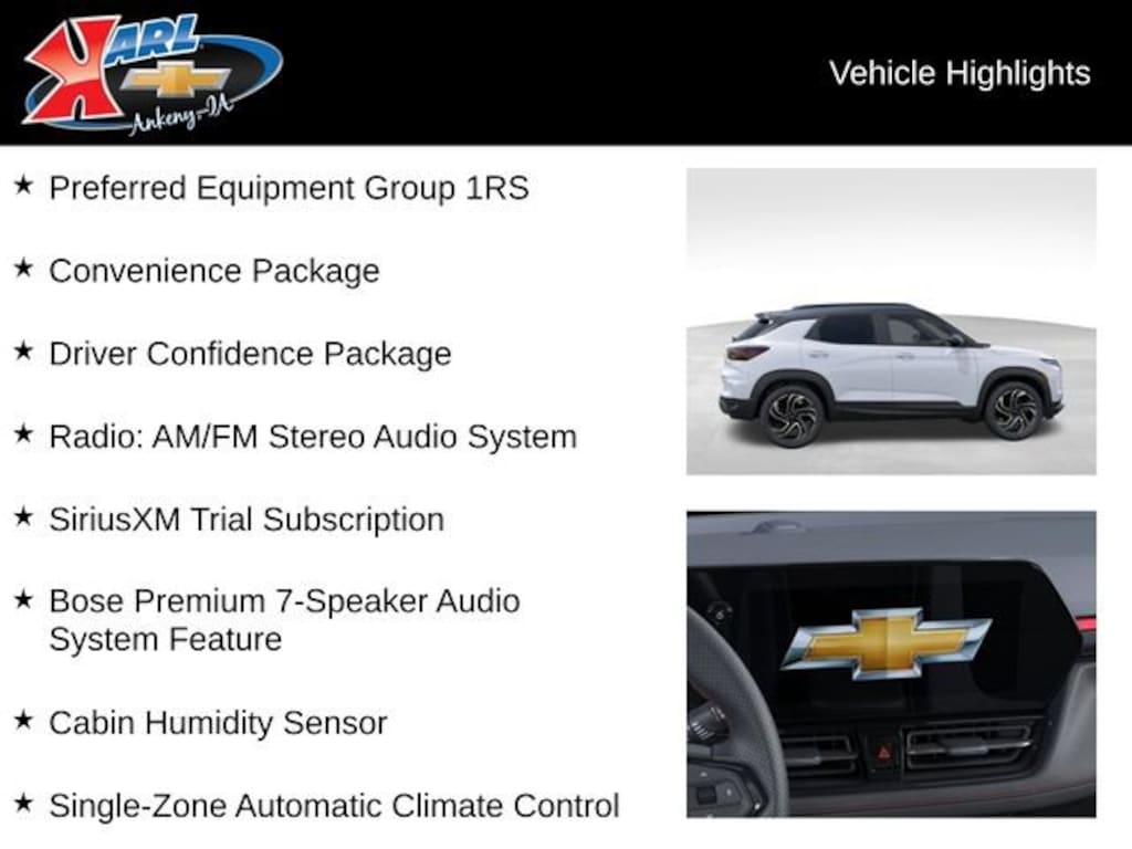 Factory MSRP: $36,240 $2,546 off MSRP! 26/29 City/Highway MPG 120-Volt Power Outlet, 2-Way Power Driver Lumbar Seat Adjuster, 4-Way Manual Front Passenger Seat Adjuster, Adaptive Cruise Control, Bose Premium 7-Speaker Audio System Feature, Cabin Humidity Sensor, Convenience Package, Driver Confidence Package, Dual-Pane Panoramic Power Sunroof, Evotex Seat Trim, Flat-Folding Front Passenger Seatback, Front Bucket Seats, Front Center Armrest, Hands Free Power Programmable Liftgate, Inside Rear-View Auto-Dimming Mirror, Preferred Equipment Group 1RS, Radio: AM/FM Stereo Audio System, Rear Cross Traffic Alert, Rear Park Assist, Single-Zone Automatic Climate Control, SiriusXM Trial Subscription, Split folding rear seat, Wheels: 19 High Gloss Black Machined Aluminum, Wireless Apple CarPlay/Android Auto, Wireless Charging.