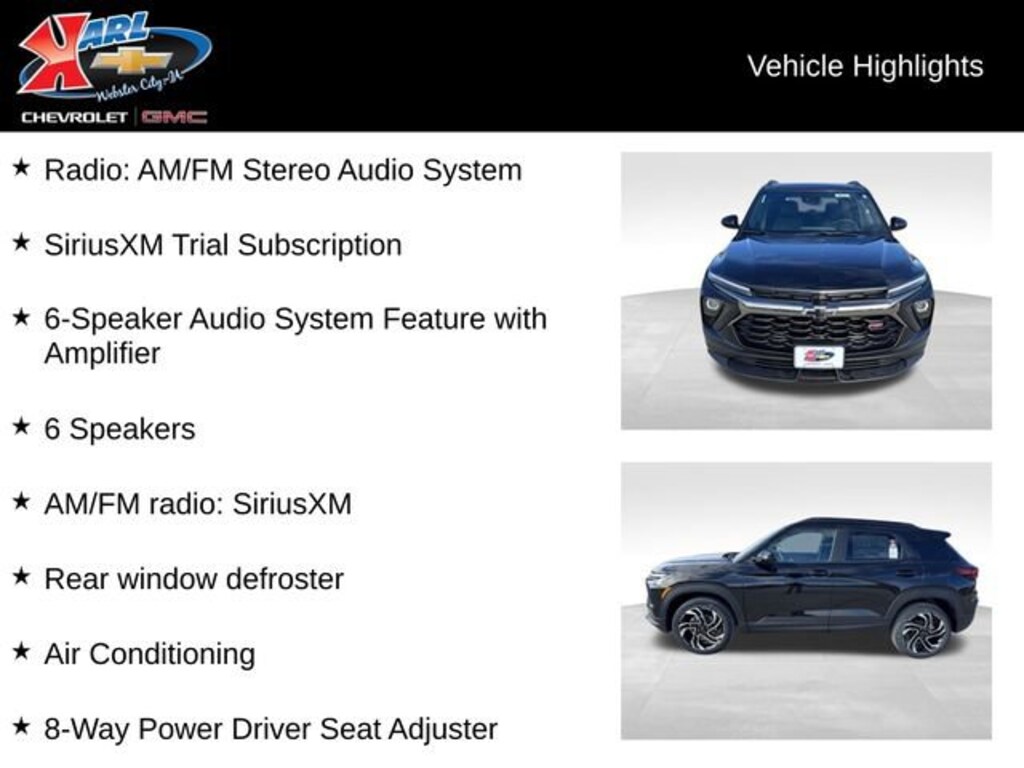 1 Type-A and 1 Type-C USB Ports, 2-Way Power Driver Lumbar Seat Adjuster, 4-Way Manual Front Passenger Seat Adjuster, 6 Speakers, 6-Speaker Audio System Feature with Amplifier, 8-Way Power Driver Seat Adjuster, Air Conditioning, AM/FM radio: SiriusXM, Brake assist, Driver door bin, Driver vanity mirror, Dual front impact airbags, Dual front side impact airbags, Electronic Stability Control, Evotex Seat Trim, Exterior Parking Camera Rear, Flat-Folding Front Passenger Seatback, Front anti-roll bar, Front Bucket Seats, Front reading lights, Heated Driver and Front Passenger Seats, Heated front seats, Heated steering wheel, Knee airbag, Occupant sensing airbag, Overhead airbag, Overhead console, Power door mirrors, Power steering, Power windows, Radio: AM/FM Stereo Audio System, Rear window defroster, Rear window wiper, Remote keyless entry, Ride and Handling Suspension, SiriusXM Trial Subscription, Telescoping steering wheel, Tilt steering wheel, Trip computer, Wheels: 19 High Gloss Black Machined Aluminum, Wireless Apple CarPlay/Android Auto. Black 2026 Chevrolet TrailBlazer RS 4D Sport Utility 1.3L I3 Turbocharged DOHC 12V LEV3-SULEV30 155hp 26/29 City/Highway MPG 9-Speed Automatic AWD