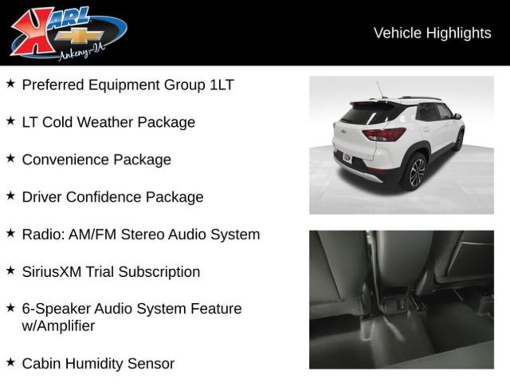 Factory MSRP: $30,275 $751 off MSRP! 26/29 City/Highway MPG 1 Type-A & 1 Type-C USB Charging-Only Ports, 1 Type-A & 1 Type-C USB Ports, 120-Volt Power Outlet, 2-Way Power Driver Lumbar Seat Adjuster, 4-Way Manual Front Passenger Seat Adjuster, 6-Speaker Audio System Feature w/Amplifier, 6-Way Manual Driver Seat Adjuster, 8-Way Power Driver Seat Adjuster, Cabin Humidity Sensor, Convenience Package, Dr & Fr Passenger Illuminated Vanity Mirrors, Driver Confidence Package, Flat-Folding Front Passenger Seatback, Front Bucket Seats, Front Center Armrest, Heated Driver & Front Passenger Seats, Heated Steering Wheel, Inside Rear-View Auto-Dimming Mirror, Lane Change Alert w/Side Blind Zone Alert, LT Cold Weather Package, Power Liftgate, Preferred Equipment Group 1LT, Radio: AM/FM Stereo Audio System, Rear Center Armrest, Rear Cross Traffic Alert, Rear Park Assist, Satin Silver & Chrome Wrapped Shift Knob, Single-Zone Automatic Climate Control, SiriusXM Trial Subscription, Split folding rear seat, Wheels: 17 High Gloss Black Machined Aluminum, Wireless Apple CarPlay/Android Auto, Wireless Charging, Wrapped Steering Wheel.Summit White 2026 Chevrolet TrailBlazer LT 4D Sport Utility 1.3L Ecotec Turbo DOHC SIDI w/VVT 9-Speed Automatic AWD