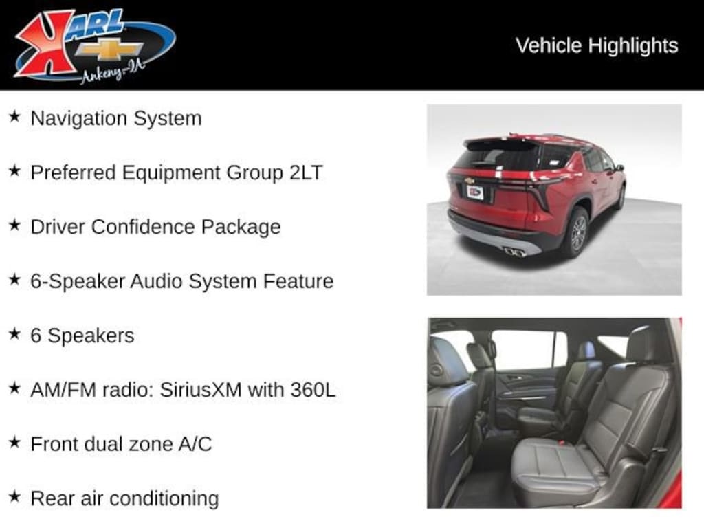 Factory MSRP: $47,415 $627 off MSRP! AWD, 3rd row seats: split-bench, 4-Way Manual Front Passenger Seat Adjuster, 6 Speakers, 6-Speaker Audio System Feature, 8-Way Power Driver Seat Adjuster, Air Conditioning, AM/FM radio: SiriusXM with 360L, Automatic temperature control, Brake assist, Child-Seat-Sensing Airbag, Driver Confidence Package, Dual front impact airbags, Dual front side impact airbags, Electronic Stability Control, Front Bucket Seats, Front Center Armrest, Front dual zone A/C, HD Surround Vision, Heated front seats, Heated steering wheel, Key Card, Navigation System, Occupant sensing airbag, Overhead airbag, Overhead console, Passenger vanity mirror, Power driver seat, Power Liftgate, Power Outlet, Power steering, Power windows, Preferred Equipment Group 2LT, Premium Cloth Seat Trim, Rear air conditioning, Rear Camera Mirror, Rear Pedestrian Alert, Rear reading lights, Telescoping steering wheel, Traffic Sign Recognition, Variably intermittent wipers, Wheels: 18 Grazen Metallic Machined-Face Aluminum.Radiant Red 2026 Chevrolet Traverse LT 4DR LT 4D Sport Utility 2.5L DOHC 8-Speed Automatic AWDThe dealer has added these accessories to this vehicle:- GM FLOOR LINERS ($404) GM FLOOR LINERS TRAVERSE ALL ROWS Price includes: $1000 - Chevrolet Bonus Cash. Exp. 03/02/2026 Price includes $404 dealer added accessories.