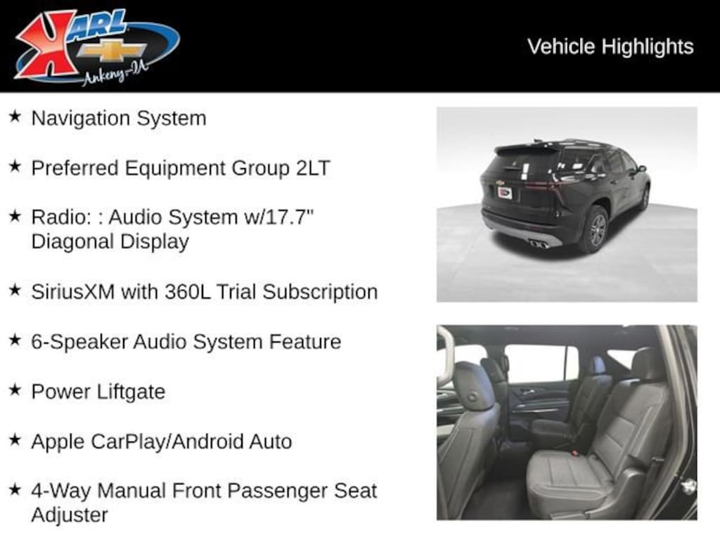 Certification Program Details: Karl Chevrolet of Ankeny, The Nation's #1 CarBravo Certified Dealer! Every CarBravo Certified vehicle includes: Comprehensive 126-Point Inspection Professionally inspected by factory-trained technicians to meet strict mechanical, safety, and cosmetic standards. 12-Month / 12,000-Mile Bumper-to-Bumper Limited Warranty Enjoy added peace of mind with extensive coverage from the day you drive off the lot. 24/7 Roadside Assistance & Courtesy Transportation Flat tire? Dead battery? Need a tow? You're covered anywhere, anytime throughout the warranty period. Vehicle History & Title Guarantee Clean title, completed safety recalls, and a full CARFAX® or AutoCheck® report provided for complete transparency. 10-Day / 500-Mile Exchange Promise If you don't absolutely love it, bring it back and exchange it no hassle, no stress. Experience peace of mind and premium protection exclusively from Karl Chevrolet of Ankeny, the Nation's #1 CarBravo Dealer!