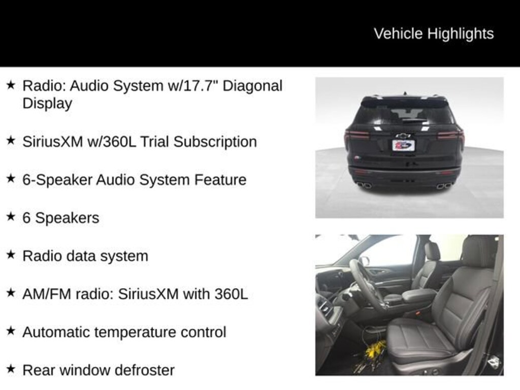Factory MSRP: $49,205 3rd row seats: split-bench, 4-Way Manual Front Passenger Seat Adjuster, 6 Speakers, 6-Speaker Audio System Feature, 8-Way Power Driver Seat Adjuster, ABS brakes, AM/FM radio: SiriusXM with 360L, Automatic temperature control, Brake assist, Dual front impact airbags, Dual front side impact airbags, Electronic Stability Control, Front anti-roll bar, Front Bucket Seats, Front Center Armrest, Front dual zone A/C, Heated Driver & Front Passenger Seats, Occupant sensing airbag, Overhead airbag, Overhead console, Power driver seat, Power Liftgate, Power steering, Premium Cloth Seat Trim, Radio data system, Radio: Audio System w/17.7 Diagonal Display, Rear reading lights, Rear window defroster, Rear window wiper, Remote keyless entry, SiriusXM w/360L Trial Subscription, Telescoping steering wheel, Wheels: 18 Grazen Metallic Machined-Face Aluminum.Recent Arrival!Black 2026 Chevrolet Traverse 4D Sport Utility LT 2.5L DOHC 19/24 City/Highway MPG 8-Speed Automatic AWDHere at Karl Chevrolet of Stuart we want to help you find the best vehicle to suit your needs. With our huge selection of new and pre-owned vehicles, we're sure to have the right car for you! We pride ourselves on creating a friendly buying experience and earning the title of Your Dealer for Life. Give us a call at 515.523.1201 and speak to our experts to find out just how easy it is to get the vehicle of your dreams!