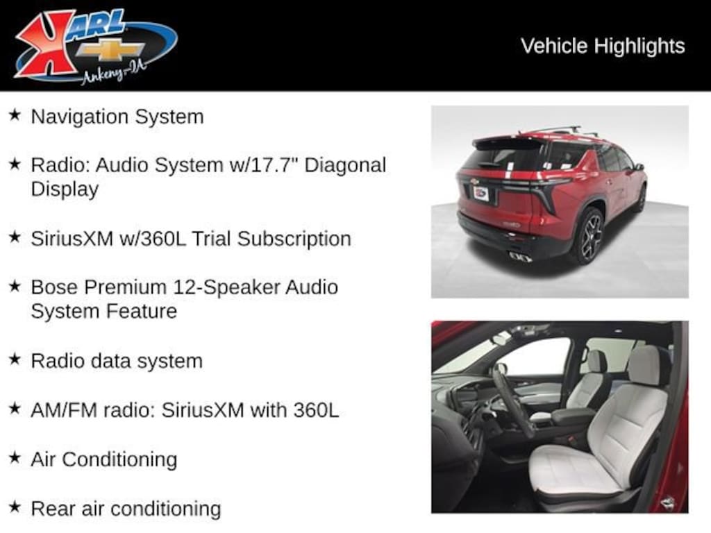 Factory MSRP: $61,540 $1,500 off MSRP! AWD, 3rd row seats: split-bench, 8-Way Power Driver Seat Adjuster, Air Conditioning, AM/FM radio: SiriusXM with 360L, Apple CarPlay/Android Auto, Auto High-beam Headlights, Auto tilt-away steering wheel, Bose Premium 12-Speaker Audio System Feature, Brake assist, Child-Seat-Sensing Airbag, Compass, Driver 4-Way Power Lumbar Seat Adjuster, Driver door bin, Driver vanity mirror, Dual front impact airbags, Dual front side impact airbags, Electronic Stability Control, Emergency communication system: OnStar, Exterior Parking Camera Rear, Front anti-roll bar, Front Center Armrest, Front dual zone A/C, Front reading lights, Garage door transmitter, Heated front seats, Heated rear seats, Heated steering wheel, Low tire pressure warning, Memory seat, Navigation System, Outside temperature display, Perforated Leather-Appointed Seat Trim, Power driver seat, Power Dual Glass Panoramic Sliding Sunroof, Power Liftgate, Power passenger seat, Power steering, Power windows, Radio data system, Rain sensing wipers, Rear air conditioning, Rear reading lights, Rear window defroster, Remote keyless entry, Roof Cross Rails, Speed-sensing steering, Spoiler, Steering wheel memory, Telescoping steering wheel, Trip computer, Wheels: 22 High-Gloss Black Aluminum.