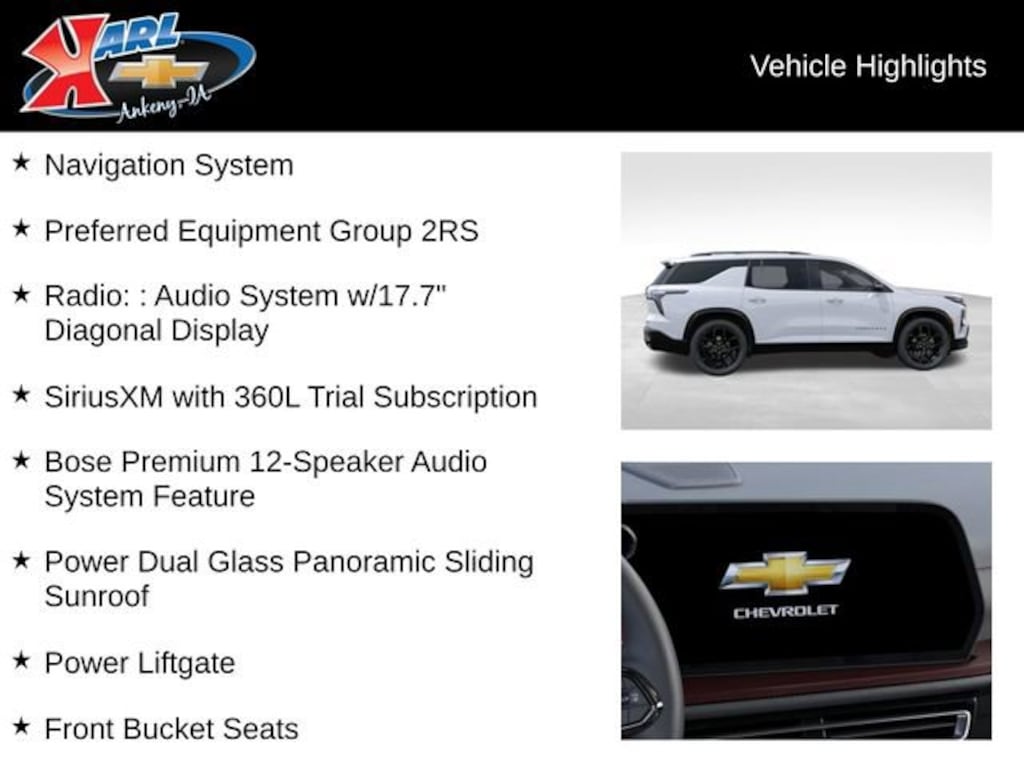 Step inside the Traverse RS and you'll be greeted by a wealth of premium features. The Perforated Leather-Appointed Seat Trim, Heated and Ventilated Front Seats, and Heated Rear Seats provide unparalleled comfort, while the Bose Premium 12-Speaker Audio System and SiriusXM with 360L Trial Subscription deliver an immersive audio experience.