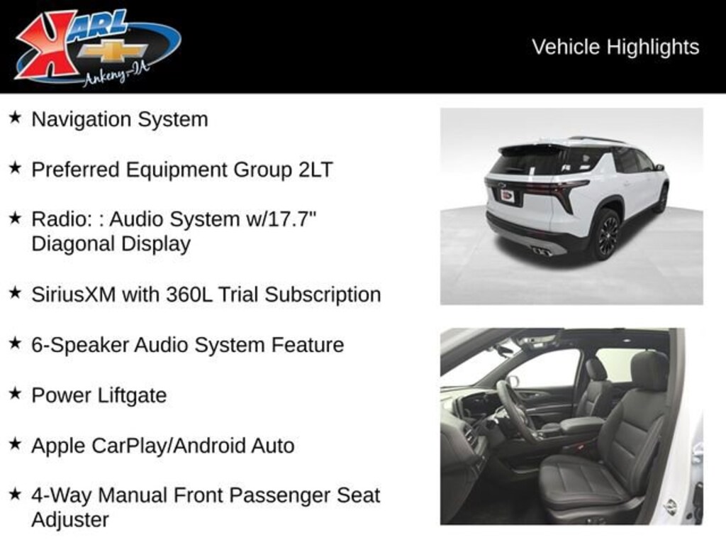 At Karl Chevrolet we want to help you find the best new or used car in Ankeny that suits your needs. When you buy a new car at Karl Chevrolet you know you're finding a vehicle you can rely on. We have a great selection of Platinum Quality Pre-Owned Vehicles. We also pride ourselves in creating a friendly atmosphere and a reliable Dealership that you can trust. Call us and our experts will be glad to help you! (515) 299-4300. *Equipment and options are generated by a 3rd party vendor, exact vehicle options may vary. Please see a salesperson for complete details and vehicle information. Price includes: $1000 - Chevrolet Bonus Cash. Exp. 03/02/2026