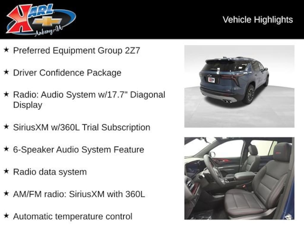 Factory MSRP: $53,520 AWD, 3rd row seats: split-bench, 4-Way Manual Front Passenger Seat Adjuster, 6-Speaker Audio System Feature, 8-Way Power Driver Seat Adjuster, Air Conditioning, AM/FM radio: SiriusXM with 360L, Automatic temperature control, Brake assist, Child-Seat-Sensing Airbag, Compass, Driver Confidence Package, Driver vanity mirror, Dual front impact airbags, Dual front side impact airbags, Electronic Stability Control, Evotex Seat Trim, Front Bucket Seats, Front Center Armrest, Front reading lights, HD Surround Vision, Heated door mirrors, Heated Driver & Front Passenger Seats, Heated front seats, Key Card, Occupant sensing airbag, Overhead console, Passenger vanity mirror, Power door mirrors, Power driver seat, Power Dual Glass Panoramic Sliding Sunroof, Power Liftgate, Power Outlet, Power windows, Preferred Equipment Group 2Z7, Radio data system, Radio: Audio System w/17.7 Diagonal Display, Rear air conditioning, Rear Camera Mirror, Rear Pedestrian Alert, Rear reading lights, Rear window defroster, Rear window wiper, Remote keyless entry, SiriusXM w/360L Trial Subscription, Steering wheel mounted audio controls, Traffic Sign Recognition, Turn signal indicator mirrors, Wheels: 18 High Gloss Black Painted Aluminum.