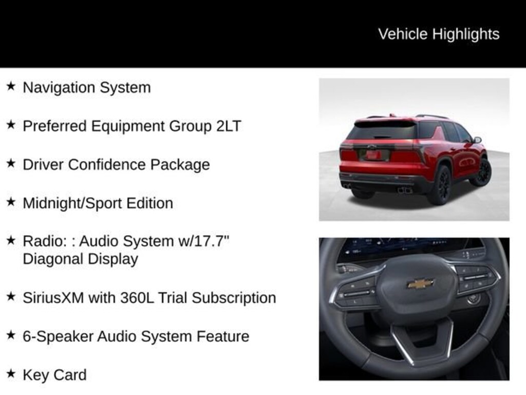 Elevate your driving experience with the stunning 2026 Chevrolet Traverse LT. This versatile SUV is the perfect blend of style, capability, and cutting-edge technology, making it the ideal choice for those who demand more from their vehicle.- Driver Confidence Package- Midnight/Sport Edition- Preferred Equipment Group 2LT- 6-Speaker Audio System Feature- Radio: Audio System w/17.7 Diagonal Display- SiriusXM with 360L Trial Subscription- Power Liftgate- High Gloss Black Door Upper Molding- Power Outlet- Apple CarPlay/Android Auto- HD Surround Vision- Rear Camera Mirror- Rear Pedestrian Alert- Traffic Sign Recognition- Navigation System- Key Card- 3rd row seats: split-bench- 4-Way Manual Front Passenger Seat Adjuster- Front Bucket Seats- Front Center Armrest- Heated Driver and Front Passenger Seats- Split folding rear seat- Wheels: 20 High Gloss Black Painted AluminumBoasting a powerful 2.5L DOHC engine and an 8-speed automatic transmission with all-wheel drive, the 2026 Traverse LT delivers an exceptional driving experience. With an EPA-estimated 20 city/24 highway mpg, this SUV strikes the perfect balance between performance and efficiency.The exterior of the Traverse LT is a stunning display of Chevrolet's design prowess, featuring a bold, commanding presence in a vibrant Red hue. The sleek, aerodynamic lines and muscular stance give this SUV a confident, premium appearance that is sure to turn heads wherever you go.Step inside the 2026 Traverse LT and you'll be greeted by a spacious, well-appointed cabin that offers ample room for passengers and cargo. The premium cloth seating, heated front seats, and a host of advanced tech features, including the 17.7-inch diagonal display, SiriusXM with 360L, and Apple CarPlay/Android Auto, ensure a truly enjoyable and connected driving experience.Safety is also a top priority in the Traverse LT, with features like HD Surround Vision, Rear Camera Mirror, Rear Pedestrian Alert, and Traffic Sign Recognition providing you with added peace of mind on the road.Whether you're embarking on a family adventure, commuting in style, or simply seeking a versatile and capable SUV, the 2026 Chevrolet Traverse LT is the perfect choice. Experience the difference for yourself and schedule a test drive today.At Karl Chevrolet Stuart we want to help you find the best new or used car in Stuart that suits your needs. When you buy a new car at Karl Chevrolet Stuart you know you're finding a vehicle you can rely on. We have a great selection of CarBravo Quality Pre-Owned Vehicles. We also pride ourselves in creating a friendly atmosphere and a reliable Dealership that you can trust. Call us and our experts will be glad to help you! (515) 523-1201. *Equipment and options are generated by a 3rd party vendor, exact vehicle options may vary. Please see a salesperson for complete details and vehicle information.