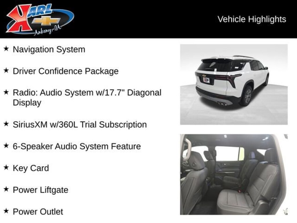Factory MSRP: $45,920 AWD, 3rd row seats: split-bench, 4-Way Manual Front Passenger Seat Adjuster, 6-Speaker Audio System Feature, Apple CarPlay/Android Auto, Driver Confidence Package, Front Bucket Seats, Front Center Armrest, HD Surround Vision, Heated Driver & Front Passenger Seats, Key Card, Navigation System, Power Liftgate, Power Outlet, Radio: Audio System w/17.7 Diagonal Display, Rear Camera Mirror, Rear Pedestrian Alert, SiriusXM w/360L Trial Subscription, Traffic Sign Recognition, Wheels: 18 Grazen Metallic Machined-Face Aluminum.