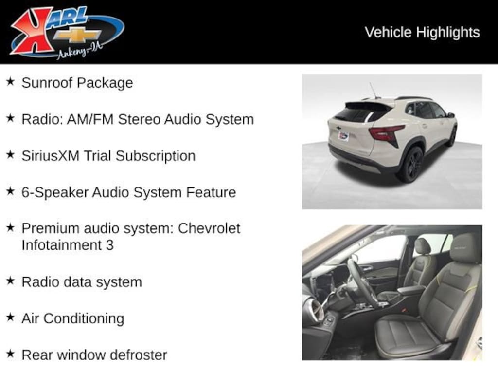 Factory MSRP: $28,385 28/32 City/Highway MPG 2-Way Adjustable Front Head Restraints, 2-Way Power Driver Lumbar Seat Adjuster, 4-Way Manual Front Passenger Seat Adjuster, 6-Speaker Audio System Feature, 8-Way Power Driver Seat Adjuster, Adaptive Cruise Control, Air Conditioning, Brake assist, Exterior Parking Camera Rear, Front Bucket Seats, Front reading lights, Heated Driver and Front Passenger Seats, Heated front seats, Heated steering wheel, Power driver seat, Power Sliding Glass Sunroof with Manual Shade, Power steering, Power windows, Premium audio system: Chevrolet Infotainment 3, Radio data system, Radio: AM/FM Stereo Audio System, Rear window defroster, Rear window wiper, SiriusXM Trial Subscription, Steering wheel mounted audio controls, Sunroof Package, Wheels: 18 Black-Painted Aluminum, Wireless Apple CarPlay/Wireless Android Auto, Wireless Charging.