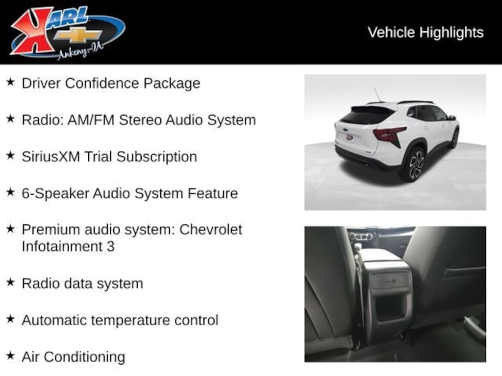Factory MSRP: $27,789 28/32 City/Highway MPG 2-Way Adjustable Front Head Restraints, 2-Way Power Driver Lumbar Seat Adjuster, 6-Speaker Audio System Feature, 8-Way Power Driver Seat Adjuster, Adaptive Cruise Control, Air Conditioning, Automatic temperature control, Brake assist, Driver Confidence Package, Driver door bin, Driver vanity mirror, Dual front impact airbags, Electronic Stability Control, Evotex Seat Trim, Exterior Parking Camera Rear, Front Center Armrest, Front reading lights, Heated door mirrors, Heated front seats, Heated steering wheel, Low tire pressure warning, Occupant sensing airbag, Power door mirrors, Power steering, Premium audio system: Chevrolet Infotainment 3, Radio data system, Radio: AM/FM Stereo Audio System, Rear Cross Traffic Alert, Rear Park Assist, Rear window wiper, Remote keyless entry, SiriusXM Trial Subscription, Sport steering wheel, Steering wheel mounted audio controls, Tachometer, Wheels: 19 Black-Painted Machined Aluminum, Wireless Apple CarPlay/Wireless Android Auto.