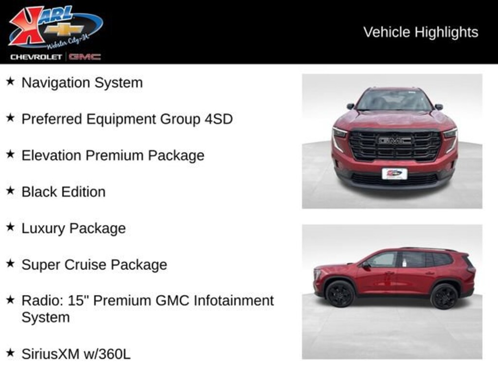 Introducing the stunning 2026 GMC Acadia Elevation - a true masterpiece of modern automotive design. This remarkable SUV is poised to redefine your driving experience, offering a perfect blend of power, style, and cutting-edge technology.Meticulously crafted with your needs in mind, the Acadia Elevation boasts an impressive array of features, including:- Black Edition- Elevation Premium Package- Luxury Package- Preferred Equipment Group 4SD- Super Cruise PackageStep inside and be captivated by the premium Bose sound system, the expansive 15 GMC Infotainment System, and the convenience of SiriusXM with 360L. The 8 Head-Up Display and Super Cruise technology will elevate your driving experience to new heights, while the heated front and rear seats ensure your comfort in any weather.Beneath the sleek exterior lies a powerful 2.5L DOHC engine, paired with an 8-speed automatic transmission and all-wheel drive, delivering a thrilling performance that will leave you in awe. With an impressive fuel efficiency of 20 city/23 highway MPG, the Acadia Elevation is not only a joy to drive but also remarkably eco-friendly.Designed to turn heads, the Acadia Elevation's bold, distinctive styling is enhanced by the Gloss Black Roof Rails, 18 Aluminum Wheels, and the striking Red exterior color. The Laminated Acoustic Glass and Enhanced Automatic Parking Assist further elevate the Acadia's refined and sophisticated presence.Step into the future of SUV driving with the 2026 GMC Acadia Elevation. This exceptional vehicle is more than just a mode of transportation - it's a statement of your refined taste and your commitment to the ultimate driving experience.At Karl Chevrolet/GMC we want to help you find the best new or used car in Webster City that suits your needs. When you buy a new car at Karl Chevrolet/GMC you know you're finding a vehicle you can rely on. We have a great selection of CarBravo Quality Pre-Owned Vehicles. We also pride ourselves in creating a friendly atmosphere and a reliable Dealership that you can trust. Call us and our experts will be glad to help you! (515) 209-7117. *Equipment and options are generated by a 3rd party vendor, exact vehicle options may vary. Please see a salesperson for complete details and vehicle information.