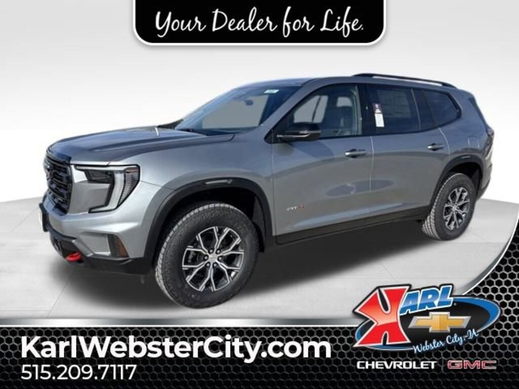 Discover the 2026 GMC Acadia AT4 - a versatile and capable SUV that's ready to elevate your driving experience. With its striking Gray exterior, this Acadia boasts a powerful 2.5L DOHC engine paired with an 8-Speed Automatic transmission and All-Wheel Drive, delivering an impressive blend of performance and efficiency.- Preferred Equipment Group 4SB- Navigation System- Bose Premium 12-Speaker System w/Sub-Woofer- Radio: 15 Premium GMC Infotainment System- SiriusXM w/360L- 6-Way Power Front Passenger Seat Adjuster- 8-Way Power Driver Seat Adjuster- Driver 2-Way Power Lumbar Seat Adjuster- Power Liftgate- Apple CarPlay/Android Auto- 3rd row seats: split-bench- 7-Passenger Seating (2-2-3 Seating Configuration)- Cloth/CoreTec Seat Trim- Front Bucket Seats- Front Center Armrest- Front Passenger Power Lumbar Seat Adjuster- Heated Driver & Front Passenger Seats- Wheels: 18 x 8 Dark Machined AluminumCombining rugged capability with refined comfort, the Acadia AT4 is designed to handle your adventures with ease. Experience the convenience of features like the Power Liftgate, Heated Front Seats, and the Premium Infotainment System with Navigation and Bose Sound.Safety is paramount, and the Acadia AT4 delivers with a comprehensive suite of advanced driver-assistance technologies, including Automatic Emergency Braking, Lane Departure Warning, and Blind Spot Monitoring. You can drive with confidence, knowing you and your passengers are well-protected.Whether you're navigating the city streets or tackling the great outdoors, the 2026 GMC Acadia AT4 is the perfect companion. With its impressive fuel efficiency, roomy interior, and exceptional versatility, this SUV is ready to elevate your driving experience. Schedule a test drive today and discover the power and capability of the Acadia AT4.At Karl Chevrolet/GMC we want to help you find the best new or used car in Webster City that suits your needs. When you buy a new car at Karl Chevrolet/GMC you know you're finding a vehicle you can rely on. We have a great selection of CarBravo Quality Pre-Owned Vehicles. We also pride ourselves in creating a friendly atmosphere and a reliable Dealership that you can trust. Call us and our experts will be glad to help you! (515) 209-7117. *Equipment and options are generated by a 3rd party vendor, exact vehicle options may vary. Please see a salesperson for complete details and vehicle information.