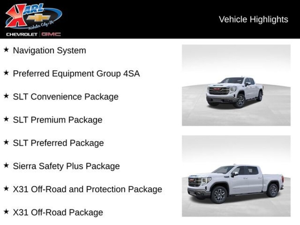 Experience the Pinnacle of Capability and Comfort in the 2026 GMC Sierra 1500 SLTIntroducing the 2026 GMC Sierra 1500 SLT, a true workhorse that seamlessly blends uncompromising power, advanced technology, and refined luxury. This exceptional full-size pickup is the embodiment of GMC's commitment to delivering vehicles that exceed expectations.- Navigation System- Premium Bose 7-Speaker Sound System- SiriusXM with 360L Trial Subscription- Steering Wheel Audio Controls- Electric Rear-Window Defogger- 120-Volt Bed Mounted Power Outlet- Power Rear Windows with Express Down- Remote Vehicle Starter System- Auto-Locking Rear Differential- Keyless Open and Start- Adaptive Cruise Control- Heated and Ventilated Front Seats- Perforated Leather-Appointed SeatingBeneath the sculpted exterior lies the formidable EcoTec3 5.3L V8 engine, mated to a smooth-shifting 10-speed automatic transmission and a capable 4WD system. With 15 MPG in the city and 18 MPG on the highway, this Sierra 1500 SLT delivers impressive efficiency without sacrificing its impressive towing and hauling capabilities.The Sierra 1500 SLT's thoughtfully designed cabin is a sanctuary of comfort and convenience. Sink into the heated and ventilated perforated leather-appointed front seats, which offer 10-way power adjustability and lumbar support for unparalleled long-haul comfort. The premium Bose 7-speaker audio system and wireless Apple CarPlay/Android Auto integration ensure you stay connected and entertained on every journey.Safety is paramount in the Sierra 1500 SLT, with features like Adaptive Cruise Control, Rear Cross Traffic Braking, and Rear Pedestrian Detection keeping you and your loved ones secure. The HD Surround Vision camera system and Ultrasonic Front and Rear Park Assist make navigating tight spaces a breeze.Whether you're tackling tough jobs or embarking on family adventures, the 2026 GMC Sierra 1500 SLT is the ultimate companion. Experience the pinnacle of capability, comfort, and technology in this exceptional full-size pickup.At Karl Chevrolet/GMC we want to help you find the best new or used car in Webster City that suits your needs. When you buy a new car at Karl Chevrolet/GMC you know you're finding a vehicle you can rely on. We have a great selection of CarBravo Quality Pre-Owned Vehicles. We also pride ourselves in creating a friendly atmosphere and a reliable Dealership that you can trust. Call us and our experts will be glad to help you! (515) 209-7117. *Equipment and options are generated by a 3rd party vendor, exact vehicle options may vary. Please see a salesperson for complete details and vehicle information. Price includes: $1500 - Buick GMC Bonus Cash. Exp. 04/30/2026 $1750 - Buick & GMC Consumer Cash Program. Exp. 04/30/2026