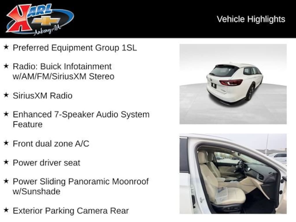 Recent Arrival! CARFAX One-Owner & Local Trade! Clean CARFAX. Certified. Summit White 2019 Buick Regal TourX Essence 5DR WGN ESSENCE AWD 2.0L 4-Cylinder DGI DOHC VVT Turbocharged Alloy wheels, Apple CarPlay/Android Auto, Enhanced 7-Speaker Audio System Feature, Exterior Parking Camera Rear, Front dual zone A/C, Fully automatic headlights, Heated Driver & Front Passenger Seats, Heated steering wheel, Power driver seat, Power Sliding Panoramic Moonroof w/Sunshade, Preferred Equipment Group 1SL, Radio: Buick Infotainment w/AM/FM/SiriusXM Stereo, SiriusXM Radio. 21/29 City/Highway MPG 8-Speed Automatic AWDAt Karl Chevrolet we want to help you find the best new or used car in Ankeny that suits your needs. Check out the 2019 Buick Regal TourX For Sale in Ankeny, IA. When you buy a new car at Karl Chevrolet you know you're finding a vehicle you can rely on. We have a great selection of Platinum Quality Pre-Owned Vehicles. We also pride ourselves in creating a friendly atmosphere and reliable new car dealership that you can trust. Call us with any questions about our 2019 Buick Regal TourX and our experts will be glad to help you! (515) 299-4300. *Equipment and options are generated by a 3rd party vendor, exact vehicle options may vary. Please see a salesperson for complete details and vehicle information.Certification Program Details: Karl Chevrolet of Ankeny, your newest CarBravo dealer, where platinum quality vehicles and unmatched benefits come together! -Comprehensive Limited Bumper to Bumper Warranty. -24/7 Roadside Assistance: -Multi-Point Vehicle Inspection: Every vehicle undergoes a Platinum Quality Certified Inspection known throughout the industry to ensure top quality. -Vehicle Exchange Program. Within 10-Days and 500 miles -Complimentary Vehicle History Report -Nationwide Dealer Network Support: Enjoy the backing of the extensive CarBravo and GM dealership network. -OnStar and SiriusXM Trials: Enjoy connected services and entertainment with included trial subscriptions. -Terms and conditions may apply. With every vehicle purchased, you'll enjoy the peace of mind that comes with a limited warranty, 24/7 roadside assistance, and a comprehensive vehicle inspection.