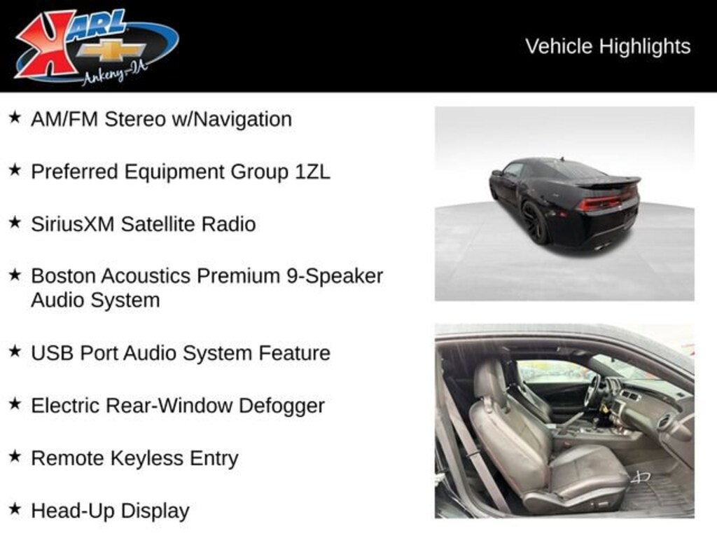 Recent Arrival! Clean CARFAX. Local Trade! Certified. Black 2015 Chevrolet Camaro ZL1 2DR CPE ZL1 6.2L V8 Supercharged 2 Front Cup Holders, 20 x 10 Fr & 20 x 11 Rr 10-Spoke Wheels, 3-Spoke Leather-Wrapped Steering Wheel, AM/FM Stereo w/Navigation, Analog Instrumentation, Body-Color Roof Ditch Molding, Boston Acoustics Premium 9-Speaker Audio System, Carpeted Front Floor Mats, Color Display Driver Information Center, Electric Rear-Window Defogger, Electronic Cruise Control, Exterior Parking Camera Rear, Head-Up Display, Heated Driver & Front Passenger Seats, High-Intensity Discharge Headlamps, LATCH System, Leather-Wrapped Shift Knob, Maintenance-Free Battery, Manual Rake & Telescopic Steering Column, OnStar 6 Months Directions & Connections Plan, Power driver seat, Power Programmable Door Locks, Power Sunroof w/Express-Open & Venting, Preferred Equipment Group 1ZL, Remote Keyless Entry, SiriusXM Satellite Radio, StabiliTrak, Steering Wheel Mounted Audio Controls, Tire Sealant & Inflator Kit, Universal Home Remote, USB Port Audio System Feature. 14/19 City/Highway MPG 6-Speed Manual RWDAt Karl Chevrolet we want to help you find the best new or used car in Ankeny that suits your needs. Check out the 2015 Chevrolet Camaro For Sale in Ankeny, IA. When you buy a new car at Karl Chevrolet you know you're finding a vehicle you can rely on. We have a great selection of Platinum Quality Pre-Owned Vehicles. We also pride ourselves in creating a friendly atmosphere and reliable new car dealership that you can trust. Call us with any questions about our 2015 Chevrolet Camaro and our experts will be glad to help you! (515) 299-4300. *Equipment and options are generated by a 3rd party vendor, exact vehicle options may vary. Please see a salesperson for complete details and vehicle information.Certification Program Details: Karl Chevrolet of Ankeny, your newest CarBravo dealer, where platinum quality vehicles and unmatched benefits come together! -Comprehensive Limited Bumper to Bumper Warranty. -24/7 Roadside Assistance: -Multi-Point Vehicle Inspection: Every vehicle undergoes a Platinum Quality Certified Inspection known throughout the industry to ensure top quality. -Vehicle Exchange Program. Within 10-Days and 500 miles -Complimentary Vehicle History Report -Nationwide Dealer Network Support: Enjoy the backing of the extensive CarBravo and GM dealership network. -OnStar and SiriusXM Trials: Enjoy connected services and entertainment with included trial subscriptions. -Terms and conditions may apply. With every vehicle purchased, you'll enjoy the peace of mind that comes with a limited warranty, 24/7 roadside assistance, and a comprehensive vehicle inspection.