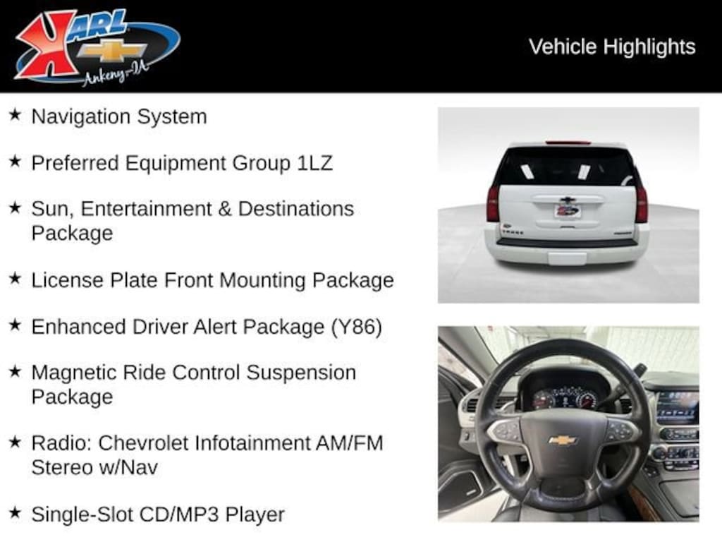 At Karl Chevrolet we want to help you find the best new or used car in Ankeny that suits your needs. Check out the 2019 Chevrolet Tahoe For Sale in Ankeny, IA. When you buy a new car at Karl Chevrolet you know you're finding a vehicle you can rely on. We have a great selection of Platinum Quality Pre-Owned Vehicles. We also pride ourselves in creating a friendly atmosphere and reliable new car dealership that you can trust. Call us with any questions about our 2019 Chevrolet Tahoe and our experts will be glad to help you! (515) 299-4300. *Equipment and options are generated by a 3rd party vendor, exact vehicle options may vary. Please see a salesperson for complete details and vehicle information.