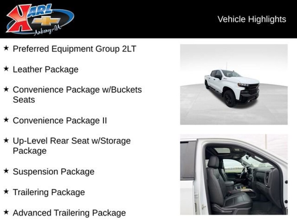 Certification Program Details: Karl Chevrolet of Ankeny, The Nation's #1 CarBravo Certified Dealer! Every CarBravo Certified vehicle includes: Comprehensive 126-Point Inspection Professionally inspected by factory-trained technicians to meet strict mechanical, safety, and cosmetic standards. 12-Month / 12,000-Mile Bumper-to-Bumper Limited Warranty Enjoy added peace of mind with extensive coverage from the day you drive off the lot. 24/7 Roadside Assistance & Courtesy Transportation Flat tire? Dead battery? Need a tow? You're covered anywhere, anytime throughout the warranty period. Vehicle History & Title Guarantee Clean title, completed safety recalls, and a full CARFAX® or AutoCheck® report provided for complete transparency. 10-Day / 500-Mile Exchange Promise If you don't absolutely love it, bring it back and exchange it no hassle, no stress. Experience peace of mind and premium protection exclusively from Karl Chevrolet of Ankeny, the Nation's #1 CarBravo Dealer!- Power Sunroof- Leather Package- Convenience Package II- Convenience Package with Bucket Seats- Advanced Trailering Package- Up-Level Rear Seat with Storage PackageThis 2020 Chevrolet Silverado 1500 LT Trail Boss 4WD CREW CAB 147 LT is a rugged and capable truck that's ready to take on any adventure. Powered by the reliable EcoTec3 5.3L V8 engine and equipped with 4-wheel drive, this Silverado has the muscle to tackle tough terrain and tow heavy loads with ease.The exterior features a striking white paint job, complemented by the bold, blacked-out Trail Boss styling cues. LED headlights and fog lamps provide excellent visibility, while the power-sliding rear window and power sunroof add to the truck's versatility and premium feel.Inside, the cabin is packed with comfort and convenience features. The Convenience Package with Bucket Seats provides a 10-way power driver's seat, heated front seats, and a heated steering wheel, ensuring a comfortable ride no matter the weather. The Convenience Package II adds even more tech-savvy amenities, including a Bose premium sound system, a 120-volt power outlet in the bed, and an advanced trailering system.The Silverado's impressive capabilities are further enhanced by the Advanced Trailering Package, which includes hitch guidance, an integrated trailer brake controller, and the advanced trailering system. Whether you're hauling a boat, camper, or heavy equipment, this truck is up to the task.This 2020 Chevrolet Silverado 1500 LT Trail Boss 4WD CREW CAB 147 LT is a true workhorse with a refined, premium touch. Experience the power, capability, and comfort of this exceptional truck for yourself. Schedule a test drive today and discover why the Silverado is the perfect choice for your next adventure.At Karl Chevrolet we want to help you find the best new or used car in Ankeny that suits your needs. When you buy a new car at Karl Chevrolet you know you're finding a vehicle you can rely on. We have a great selection of Platinum Quality Pre-Owned Vehicles. We also pride ourselves in creating a friendly atmosphere and a reliable Dealership that you can trust. Call us and our experts will be glad to help you! (515) 299-4300. *Equipment and options are generated by a 3rd party vendor, exact vehicle options may vary. Please see a salesperson for complete details and vehicle information.