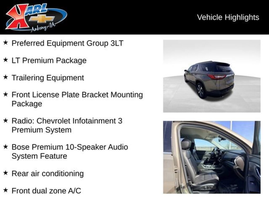 Certification Program Details: Karl Chevrolet of Ankeny, The Nation's #1 CarBravo Certified Dealer! Every CarBravo Certified vehicle includes: Comprehensive 126-Point Inspection Professionally inspected by factory-trained technicians to meet strict mechanical, safety, and cosmetic standards. 12-Month / 12,000-Mile Bumper-to-Bumper Limited Warranty Enjoy added peace of mind with extensive coverage from the day you drive off the lot. 24/7 Roadside Assistance & Courtesy Transportation Flat tire? Dead battery? Need a tow? You're covered anywhere, anytime throughout the warranty period. Vehicle History & Title Guarantee Clean title, completed safety recalls, and a full CARFAX® or AutoCheck® report provided for complete transparency. 10-Day / 500-Mile Exchange Promise If you don't absolutely love it, bring it back and exchange it no hassle, no stress. Experience peace of mind and premium protection exclusively from Karl Chevrolet of Ankeny, the Nation's #1 CarBravo Dealer!- LT Premium Package- Trailering Equipment- Front License Plate Bracket Mounting Package- Bose Premium 10-Speaker Audio System- Radio: Chevrolet Infotainment 3 Premium System- Front dual zone A/C- Rear air conditioning- Power driver seat- High-Intensity Discharge Headlights- Heavy-Duty Cooling System- 120-Volt Power Outlet- Apple CarPlay/Android Auto- HD Surround Vision- Rear Camera Mirror- 3rd row seats: split-bench- Hitch Guidance w/Hitch View- Trailering Assist Guidelines- Wheels: 20 Machined Face AluminumThis 2020 Chevrolet Traverse 3LT AWD is a remarkable family-friendly SUV that combines style, capability, and advanced technology. With its spacious 3-row seating, powerful 3.6L V6 engine, and premium features, this Traverse is ready to take on your daily adventures and weekend getaways with ease.The LT Premium Package elevates the Traverse with a stunning 8-inch Chevrolet Infotainment 3 Premium system, a premium Bose audio system, and a host of advanced safety technologies like HD Surround Vision and Rear Camera Mirror. The Trailering Equipment package ensures you have the power and control to tow your toys, while the Front License Plate Bracket Mounting Package provides a seamless look.Comfort and convenience are at the forefront, with features like dual-zone climate control, power driver's seat, and 120-volt power outlet. The available Apple CarPlay and Android Auto integration keep you connected on the go, and the split-folding third-row seating provides versatile cargo space.This Traverse is CarBravo Certified, meaning it has undergone a comprehensive 126-point inspection by our factory-trained technicians. You'll enjoy the peace of mind of a 12-month/12,000-mile limited warranty, 24/7 roadside assistance, and a 10-day/500-mile exchange promise. Experience the ultimate in premium protection and confidence behind the wheel of this exceptional Chevrolet Traverse.At Karl Chevrolet we want to help you find the best new or used car in Ankeny that suits your needs. When you buy a new car at Karl Chevrolet you know you're finding a vehicle you can rely on. We have a great selection of Platinum Quality Pre-Owned Vehicles. We also pride ourselves in creating a friendly atmosphere and a reliable Dealership that you can trust. Call us and our experts will be glad to help you! (515) 299-4300. *Equipment and options are generated by a 3rd party vendor, exact vehicle options may vary. Please see a salesperson for complete details and vehicle information.