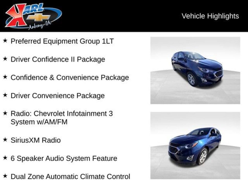 Recent Arrival! CARFAX One-Owner, Local Trade & Sold New at Karls! Clean CARFAX. Certified. Pacific Blue Metallic 2021 Chevrolet Equinox LT AWD 4DR LT W/1LT 1.5L DOHC AWD, 2 Rear USB Charging-Only Ports, 2 USB Ports & Auxiliary Input Jack, 3-Spoke Leather-Wrapped Steering Wheel, 6 Speaker Audio System Feature, Alloy wheels, Apple CarPlay/Android Auto, Auto High-beam Headlights, Bluetooth® For Phone, Confidence & Convenience Package, Driver Confidence II Package, Driver Convenience Package, Dual Zone Automatic Climate Control, Front Fog Lamps, Heated Driver & Front Passenger Seats, Lane Change Alert w/Side Blind Zone Alert, Power driver seat, Preferred Equipment Group 1LT, Radio: Chevrolet Infotainment 3 System w/AM/FM, Rear Cross Traffic Alert, Rear Park Assist w/Audible Warning, Rear Power Liftgate, Remote Start, SiriusXM Radio, Universal Home Remote. 25/30 City/Highway MPG 6-Speed Automatic Electronic with Overdrive AWDAt Karl Chevrolet we want to help you find the best new or used car in Ankeny that suits your needs. Check out the 2021 Chevrolet Equinox For Sale in Ankeny, IA. When you buy a new car at Karl Chevrolet you know you're finding a vehicle you can rely on. We have a great selection of Platinum Quality Pre-Owned Vehicles. We also pride ourselves in creating a friendly atmosphere and reliable new car dealership that you can trust. Call us with any questions about our 2021 Chevrolet Equinox and our experts will be glad to help you! (515) 299-4300. *Equipment and options are generated by a 3rd party vendor, exact vehicle options may vary. Please see a salesperson for complete details and vehicle information.Certification Program Details: Karl Chevrolet of Ankeny, your newest CarBravo dealer, where platinum quality vehicles and unmatched benefits come together! -Comprehensive Limited Bumper to Bumper Warranty. -24/7 Roadside Assistance: -Multi-Point Vehicle Inspection: Every vehicle undergoes a Platinum Quality Certified Inspection known throughout the industry to ensure top quality. -Vehicle Exchange Program. Within 10-Days and 500 miles -Complimentary Vehicle History Report -Nationwide Dealer Network Support: Enjoy the backing of the extensive CarBravo and GM dealership network. -OnStar and SiriusXM Trials: Enjoy connected services and entertainment with included trial subscriptions. -Terms and conditions may apply. With every vehicle purchased, you'll enjoy the peace of mind that comes with a limited warranty, 24/7 roadside assistance, and a comprehensive vehicle inspection.