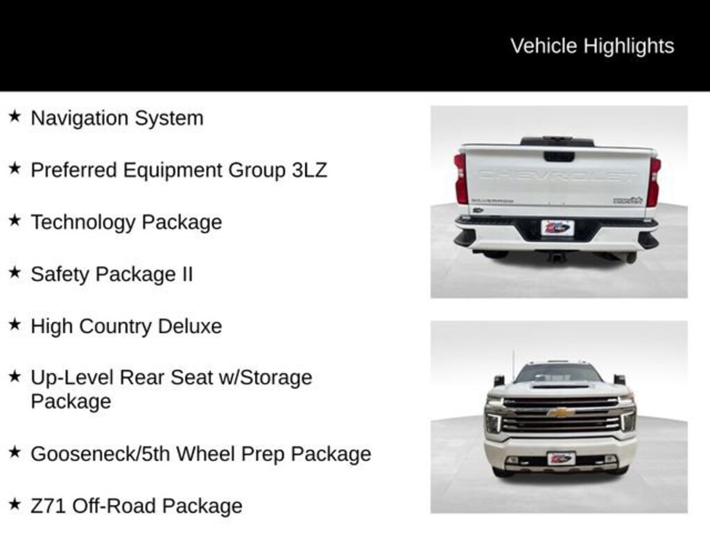 Certified.Summit White High Country 4WD Duramax 6.6L V8 Turbodiesel10-Way Power Driver Seat Adjuster w/Lumbar, 10-Way Power Passenger Seat Adjuster w/Lumbar, 12-Volt Rear Auxiliary Power Outlet, 120-Volt Bed Mounted Power Outlet, 120-Volt Instrument Panel Power Outlet, 15 Diagonal Multicolor Head-Up Display, 170 Amp Alternator, 4G LTE Wi-Fi Hotspot Capable, 6 Rectangular Chromed Tubular Assist Steps, 8 Diagonal Multicolor Digital Display DIC, Advanced Trailering System, Auto-Dimming Inside Rear-View Mirror, Automatic Emergency Braking, Bed View Camera w/2 Trailer Camera Provisions, Black Chevytec Spray-On Bedliner w/Chevrolet Logo, Bluetooth® For Phone, Chevrolet Connected Access Capable, Chrome Front Grille, Chrome Mirror Caps, Chrome Recovery Hooks, Color-Keyed Carpeting Floor Covering, Compass, Deep-Tinted Glass, Driver Memory, Dual Charge-Only USB Ports (2nd Row), Electric Rear-Window Defogger, Electrical Lock Control Steering Column, Electronic Cruise Control w/Set & Resume Speed, Floor-Mounted Center Console, Following Distance Indicator, Forward Collision Alert, Front Carpeted Floor Mats, Front LED Fog Lamps, Gooseneck/5th Wheel Prep Package, HD Radio, HD Surround Vision w/2 Trailer View Cam Provisions, Heated & Auto-Dim Pwr Vertical Trailering Mirrors, Heated 2nd Row Outboard Seats, Heated Driver & Front Outboard Passenger Seating, Heated Steering Wheel, High Country Deluxe, Hill Descent Control, Hitch Guidance w/Hitch View, Integrated Trailer Brake Controller, IntelliBeam Automatic High Beam On/Off, Keyless Open & Start, Lane Change Alert w/Side Blind Zone Alert, Lane Departure Warning System, Leather-Wrapped Steering Wheel, LED Cargo Area Lighting, Manual Tilt & Telescoping Steering Column, Navigation System, Off-Road Suspension, OnStar & Chevrolet Connected Services Capable, Polished Exhaust Tip, Power Door Locks, Power Front Windows w/Driver Express Up/Down, Power Front Windows w/Passenger Express Up/Down, Power Rear Windows w/Express Down, Power Sliding Rear Window w/Defogger, Preferred Equipment Group 3LZ, Rear Camera Mirror, Rear Carpeted Floor Mats, Rear Cross Traffic Alert, Rear Wheelhouse Liners, Remote Vehicle Starter System, Safety Alert Seat, Safety Package II, SiriusXM w/360L, Steering Wheel Audio Controls, Suspension Package, Technology Package, Ultrasonic Front & Rear Park Assist, Unauthorized Entry Theft-Deterrent System, Universal Home Remote, Up-Level Rear Seat w/Storage Package, Ventilated Driver & Front Passenger Seats, Wireless Charging, Wireless Phone Projection, Z71 Off-Road Package.Here at Karl Chevrolet of Stuart we want to help you find the best vehicle to suit your needs. With our huge selection of new and pre-owned vehicles, we're sure to have the right car for you! We pride ourselves on creating a friendly buying experience and earning the title of Your Dealer for Life. Give us a call at 515.523.1201 and speak to our experts to find out just how easy it is to get the vehicle of your dreams!*Equipment and options are generated by a 3rd party vendor, exact vehicle options may vary. Please see a salesperson for complete details and vehicle information.Clean CARFAX.Certification Program Details: Karl Chevrolet of Stuart, your newest CarBravo dealer, where platinum quality vehicles and unmatched benefits come together! -Comprehensive Limited Bumper to Bumper Warranty. -24/7 Roadside Assistance: -Multi-Point Vehicle Inspection: Every vehicle undergoes a Platinum Quality Certified Inspection known throughout the industry to ensure top quality. -Vehicle Exchange Program. Within 10-Days and 500 miles -Complimentary Vehicle History Report -Nationwide Dealer Network Support: Enjoy the backing of the extensive CarBravo and GM dealership network. -OnStar and SiriusXM Trials: Enjoy connected services and entertainment with included trial subscriptions. -Terms and conditions may apply. With every vehicle purchased, you'll enjoy the peace of mind that comes with a lim