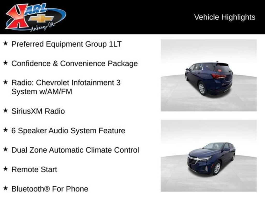 Recent Arrival! CARFAX One-Owner. Clean CARFAX. Certified. Blue Glow Metallic 2022 Chevrolet Equinox LT AWD 4DR LT W/1LT 1.5L DOHC AWD, 2 Rear USB Charging-Only Ports, 2 USB Ports & Auxiliary Input Jack, 6 Speaker Audio System Feature, Auto High-beam Headlights, Bluetooth® For Phone, Confidence & Convenience Package, Dual Zone Automatic Climate Control, Front & Rear Black Bowtie Emblems (LPO), Front & Rear Park Assist, Lane Change Alert w/Side Blind Zone Alert, Power driver seat, Preferred Equipment Group 1LT, Radio: Chevrolet Infotainment 3 System w/AM/FM, Rear Cross Traffic Alert, Remote Start, SiriusXM Radio, Wireless Apple CarPlay/Wireless Android Auto. 25/30 City/Highway MPG 6-Speed Automatic Electronic with Overdrive AWDAt Karl Chevrolet we want to help you find the best new or used car in Ankeny that suits your needs. Check out the 2022 Chevrolet Equinox For Sale in Ankeny, IA. When you buy a new car at Karl Chevrolet you know you're finding a vehicle you can rely on. We have a great selection of Platinum Quality Pre-Owned Vehicles. We also pride ourselves in creating a friendly atmosphere and reliable new car dealership that you can trust. Call us with any questions about our 2022 Chevrolet Equinox and our experts will be glad to help you! (515) 299-4300. *Equipment and options are generated by a 3rd party vendor, exact vehicle options may vary. Please see a salesperson for complete details and vehicle information.Certification Program Details: Karl Chevrolet of Ankeny, The Nation's #1 CarBravo certified dealer, where platinum quality vehicles and unmatched benefits come together! This vehicle qualifies for our CarBravo Certified program reserved for the highest-quality pre-owned vehicles that are 10 model years or newer and have less than 100,000 miles. Every CarBravo Certified vehicle includes: ? Comprehensive 126-Point Inspection Professionally inspected by factory-trained technicians to meet strict mechanical, safety, and cosmetic standards. ? 6-Month / 6,000-Mile Bumper-to-Bumper Limited Warranty Enjoy added peace of mind with extensive coverage from the day you drive off the lot. ? 24/7 Roadside Assistance & Courtesy Transportation Flat tire? Dead battery? Need a tow? You're covered anywhere, anytime throughout the warranty period. ? Vehicle History & Title Guarantee Clean title, completed safety recalls, and a full CARFAX® or AutoCheck® report provided for complete transparency. ? 10-Day / 500-Mile Exchange Promise If you donât absolutely love it, bring it back and exchange it no hassle, no stress. Experience peace of mind and premium protection exclusively from Karl Chevrolet of Ankeny, the Nation's #1 CarBravo Certified Deale