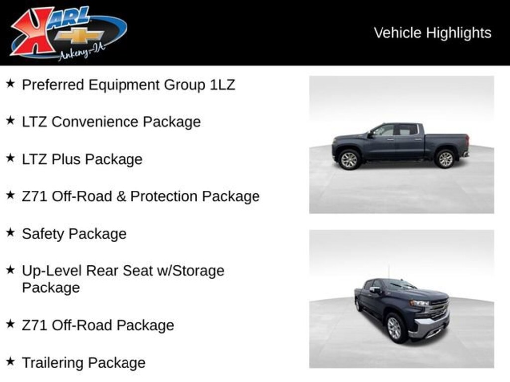 Certification Program Details: Karl Chevrolet of Ankeny, The Nation's #1 CarBravo Certified Dealer! Every CarBravo Certified vehicle includes: Comprehensive 126-Point Inspection Professionally inspected by factory-trained technicians to meet strict mechanical, safety, and cosmetic standards. 12-Month / 12,000-Mile Bumper-to-Bumper Limited Warranty Enjoy added peace of mind with extensive coverage from the day you drive off the lot. 24/7 Roadside Assistance & Courtesy Transportation Flat tire? Dead battery? Need a tow? You're covered anywhere, anytime throughout the warranty period. Vehicle History & Title Guarantee Clean title, completed safety recalls, and a full CARFAX® or AutoCheck® report provided for complete transparency. 10-Day / 500-Mile Exchange Promise If you don't absolutely love it, bring it back and exchange it no hassle, no stress. Experience peace of mind and premium protection exclusively from Karl Chevrolet of Ankeny, the Nation's #1 CarBravo Dealer!- Floor Liners, with Removable Carpet Inserts, Front- Z71 Off-Road and Protection Package- Molded Splash Guards, Black (dealer-installed)This 2022 Chevrolet Silverado 1500 LTD LTZ 4WD Crew Cab is equipped with a powerful EcoTec3 5.3L V8 engine and an 8-speed automatic transmission, delivering a confident and capable performance. With its rugged 4WD system, this Silverado is ready to tackle any terrain, whether you're hauling heavy loads or exploring off-road adventures. The Z71 Off-Road and Protection Package further enhances its off-road capabilities, with features like Hill Descent Control, skid plates, and all-terrain tires.Inside, this Silverado offers a wealth of premium features, including a Bose premium audio system, wireless phone projection, and a host of advanced safety technologies like Lane Change Alert with Side Blind Zone Alert and Rear Cross Traffic Alert. The roomy Crew Cab design provides ample space for passengers and cargo, making it the perfect choice for both work and play.Certified through Karl Chevrolet's exclusive CarBravo program, this Silverado has undergone a rigorous 126-point inspection by factory-trained technicians. It comes with a 12-month/12,000-mile bumper-to-bumper limited warranty, 24/7 roadside assistance, and a 10-day/500-mile exchange promise, giving you the peace of mind you deserve.At Karl Chevrolet, we're committed to providing our customers with the highest level of service and the best vehicles on the market. This 2022 Chevrolet Silverado 1500 LTD LTZ 4WD Crew Cab is a true testament to our dedication to excellence. Come experience the difference at Karl Chevrolet of Ankeny, the Nation's #1 CarBravo Dealer!At Karl Chevrolet we want to help you find the best new or used car in Ankeny that suits your needs. When you buy a new car at Karl Chevrolet you know you're finding a vehicle you can rely on. We have a great selection of Platinum Quality Pre-Owned Vehicles. We also pride ourselves in creating a friendly atmosphere and a reliable Dealership that you can trust. Call us and our experts will be glad to help you! (515) 299-4300. *Equipment and options are generated by a 3rd party vendor, exact vehicle options may vary. Please see a salesperson for complete details and vehicle information.