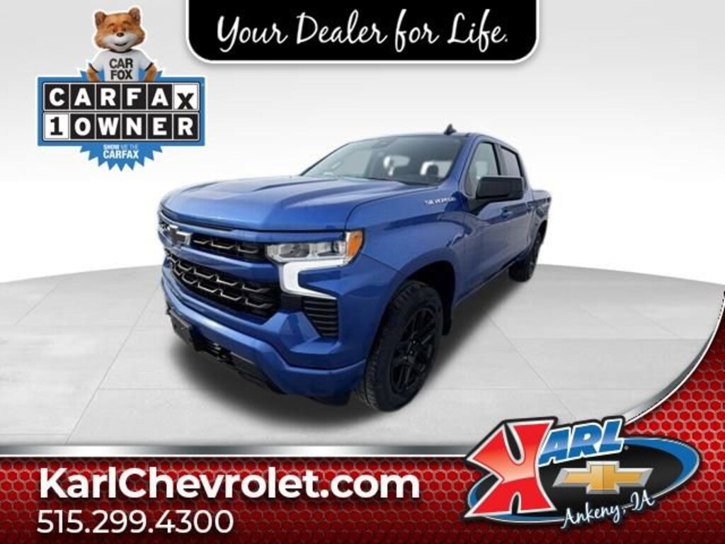 Recent Arrival! Clean CARFAX. Glacier Blue Metallic 2022 Chevrolet Silverado 1500 RST EcoTec3 5.3L V8 10-Speed Automatic, 4WD, Black Cloth. 10-Speed Automatic 4WDAt Karl Chevrolet we want to help you find the best new or used car in Ankeny that suits your needs. Check out the 2022 Chevrolet Silverado 1500 For Sale in Ankeny, IA. When you buy a new car at Karl Chevrolet you know you're finding a vehicle you can rely on. We have a great selection of Platinum Quality Pre-Owned Vehicles. We also pride ourselves in creating a friendly atmosphere and reliable new car dealership that you can trust. Call us with any questions about our 2022 Chevrolet Silverado 1500 and our experts will be glad to help you! (515) 299-4300. *Equipment and options are generated by a 3rd party vendor, exact vehicle options may vary. Please see a salesperson for complete details and vehicle information.