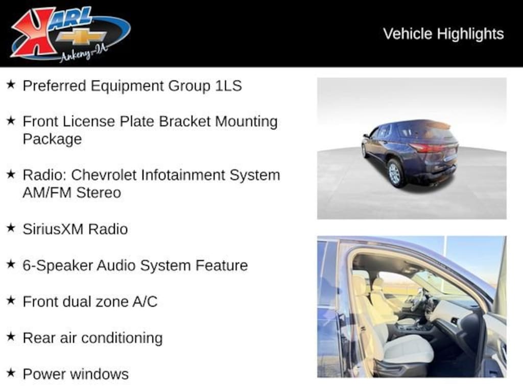 Recent Arrival! CARFAX One-Owner. Clean CARFAX. Certified. Northsky Blue Metallic 2022 Chevrolet Traverse LS 4DR AWD LS 3.6L V6 SIDI VVT AWD, 3rd row seats: split-bench, 6-Speaker Audio System Feature, Apple CarPlay/Android Auto, Auto High-beam Headlights, Exterior Parking Camera Rear, Front dual zone A/C, Front License Plate Bracket Mounting Package, Power windows, Preferred Equipment Group 1LS, Radio: Chevrolet Infotainment System AM/FM Stereo, Rear air conditioning, SiriusXM Radio. 17/25 City/Highway MPG 9-Speed Automatic AWDAt Karl Chevrolet we want to help you find the best new or used car in Ankeny that suits your needs. Check out the 2022 Chevrolet Traverse For Sale in Ankeny, IA. When you buy a new car at Karl Chevrolet you know you're finding a vehicle you can rely on. We have a great selection of Platinum Quality Pre-Owned Vehicles. We also pride ourselves in creating a friendly atmosphere and reliable new car dealership that you can trust. Call us with any questions about our 2022 Chevrolet Traverse and our experts will be glad to help you! (515) 299-4300. *Equipment and options are generated by a 3rd party vendor, exact vehicle options may vary. Please see a salesperson for complete details and vehicle information.Certification Program Details: Karl Chevrolet of Ankeny, The Nation's #1 CarBravo certified dealer, where platinum quality vehicles and unmatched benefits come together! This vehicle qualifies for our CarBravo Certified program reserved for the highest-quality pre-owned vehicles that are 10 model years or newer and have less than 100,000 miles. Every CarBravo Certified vehicle includes: ? Comprehensive 126-Point Inspection Professionally inspected by factory-trained technicians to meet strict mechanical, safety, and cosmetic standards. ? 6-Month / 6,000-Mile Bumper-to-Bumper Limited Warranty Enjoy added peace of mind with extensive coverage from the day you drive off the lot. ? 24/7 Roadside Assistance & Courtesy Transportation Flat tire? Dead battery? Need a tow? You're covered anywhere, anytime throughout the warranty period. ? Vehicle History & Title Guarantee Clean title, completed safety recalls, and a full CARFAX® or AutoCheck® report provided for complete transparency. ? 10-Day / 500-Mile Exchange Promise If you donât absolutely love it, bring it back and exchange it no hassle, no stress. Experience peace of mind and premium protection exclusively from Karl Chevrolet of Ankeny, the Nation's #1 CarBravo Certified Deale
