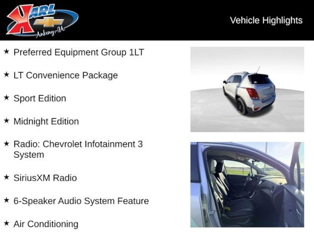 Certification Program Details: Karl Chevrolet of Ankeny, The Nation's #1 CarBravo Certified Dealer! Every CarBravo Certified vehicle includes: Comprehensive 126-Point Inspection Professionally inspected by factory-trained technicians to meet strict mechanical, safety, and cosmetic standards. 12-Month / 12,000-Mile Bumper-to-Bumper Limited Warranty Enjoy added peace of mind with extensive coverage from the day you drive off the lot. 24/7 Roadside Assistance & Courtesy Transportation Flat tire? Dead battery? Need a tow? You're covered anywhere, anytime throughout the warranty period. Vehicle History & Title Guarantee Clean title, completed safety recalls, and a full CARFAX® or AutoCheck® report provided for complete transparency. 10-Day / 500-Mile Exchange Promise If you don't absolutely love it, bring it back and exchange it no hassle, no stress. Experience peace of mind and premium protection exclusively from Karl Chevrolet of Ankeny, the Nation's #1 CarBravo Dealer!- LT CONVENIENCE PACKAGE- SPORT EDITION- LICENSE PLATE BRACKET, FRONT- 6-Speaker Audio System Feature- Radio: Chevrolet Infotainment 3 System- SiriusXM Radio- Air Conditioning- 2 Spare Keys Key System- All-Wheel Drive Chassis- 2 USB Ports w/Auxiliary Input Jack- 3-Spoke Leather-Wrapped Steering Wheel- Apple CarPlay/Android Auto- Exterior Parking Camera Rear- Keyless Open- Keyless Start- 6-Way Power Driver Seat Adjuster- Wheels: 18 Gloss Black AluminumThis 2022 Chevrolet Trax LT is a versatile and well-equipped SUV that's perfect for your active lifestyle. With its turbocharged 1.4L engine and all-wheel drive, it delivers a responsive and confident driving experience, whether you're navigating city streets or exploring the great outdoors. The sleek silver exterior and sporty styling give this Trax a premium look and feel, while the spacious interior and generous cargo capacity ensure you have plenty of room for all your gear.Inside, you'll find a wealth of advanced technology features, including the Chevrolet Infotainment 3 system with Apple CarPlay and Android Auto integration, allowing you to seamlessly connect your smartphone and access your favorite apps on the go. The 6-speaker audio system and SiriusXM radio provide excellent sound quality, while the keyless entry and start, 6-way power driver's seat, and leather-wrapped steering wheel add an extra touch of convenience and comfort.The LT Convenience Package and Sport Edition further enhance this Trax, with features like a rear parking camera, keyless start, and 18-inch gloss black aluminum wheels that give the vehicle a bold, sporty appearance. With its comprehensive 126-point inspection, 12-month/12,000-mile warranty, and 24/7 roadside assistance, this CarBravo Certified Trax offers unparalleled peace of mind and protection.At Karl Chevrolet, we're committed to providing our customers with the highest level of service and the best selection of new and pre-owned vehicles in the Ankeny area. Our team of experts is here to help you find the perfect vehicle to fit your needs and budget, and we'll work tirelessly to ensure you have a stress-free and enjoyable car-buying experience.At Karl Chevrolet we want to help you find the best new or used car in Ankeny that suits your needs. When you buy a new car at Karl Chevrolet you know you're finding a vehicle you can rely on. We have a great selection of Platinum Quality Pre-Owned Vehicles. We also pride ourselves in creating a friendly atmosphere and a reliable Dealership that you can trust. Call us and our experts will be glad to help you! (515) 299-4300. *Equipment and options are generated by a 3rd party vendor, exact vehicle options may vary. Please see a salesperson for complete details and vehicle information.