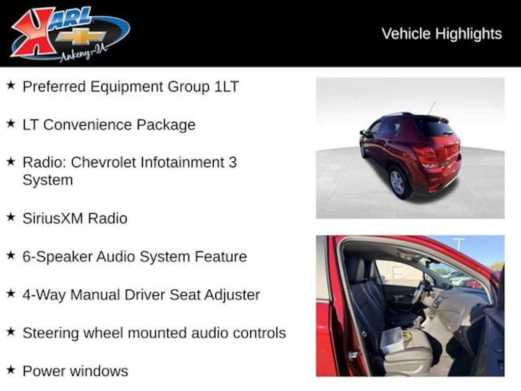 Recent Arrival! CARFAX One-Owner, Local Trade & Sold New at Karls! Clean CARFAX. Certified. Crimson Metallic 2022 Chevrolet Trax LT AWD 4DR LT Turbo 1.4L VVT DOHC 4-Cylinder DI SIDI 2 Spare Keys Key System, 2 USB Ports w/Auxiliary Input Jack, 2-Way Manual Front Passenger Seat Adjuster, 3-Spoke Leather-Wrapped Steering Wheel, 4-Way Manual Driver Seat Adjuster, 6-Speaker Audio System Feature, 6-Way Power Driver Seat Adjuster, All-Wheel Drive Chassis, Apple CarPlay/Android Auto, Exterior Parking Camera Rear, Front Bucket Seats w/Driver Power Lumbar, Keyless Open, Keyless Start, LT Convenience Package, Power windows, Preferred Equipment Group 1LT, Radio: Chevrolet Infotainment 3 System, SiriusXM Radio, Steering wheel mounted audio controls. 23/30 City/Highway MPG 6-Speed Automatic AWDAt Karl Chevrolet we want to help you find the best new or used car in Ankeny that suits your needs. Check out the 2022 Chevrolet Trax For Sale in Ankeny, IA. When you buy a new car at Karl Chevrolet you know you're finding a vehicle you can rely on. We have a great selection of Platinum Quality Pre-Owned Vehicles. We also pride ourselves in creating a friendly atmosphere and reliable new car dealership that you can trust. Call us with any questions about our 2022 Chevrolet Trax and our experts will be glad to help you! (515) 299-4300. *Equipment and options are generated by a 3rd party vendor, exact vehicle options may vary. Please see a salesperson for complete details and vehicle information.Certification Program Details: Karl Chevrolet of Ankeny, your newest CarBravo dealer, where platinum quality vehicles and unmatched benefits come together! -Comprehensive Limited Bumper to Bumper Warranty. -24/7 Roadside Assistance: -Multi-Point Vehicle Inspection: Every vehicle undergoes a Platinum Quality Certified Inspection known throughout the industry to ensure top quality. -Vehicle Exchange Program. Within 10-Days and 500 miles -Complimentary Vehicle History Report -Nationwide Dealer Network Support: Enjoy the backing of the extensive CarBravo and GM dealership network. -OnStar and SiriusXM Trials: Enjoy connected services and entertainment with included trial subscriptions. -Terms and conditions may apply. With every vehicle purchased, you'll enjoy the peace of mind that comes with a limited warranty, 24/7 roadside assistance, and a comprehensive vehicle inspection.