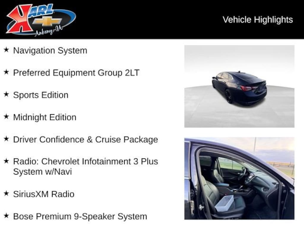 Recent Arrival! CARFAX One-Owner. Clean CARFAX. Certified. Dark Ash Metallic 2023 Chevrolet Malibu LT 4DR SDN 2LT 1.5L DOHC Jet Black Leather, Adaptive Cruise Control, Apple CarPlay/Android Auto, Auto High-beam Headlights, Automatic Parking Assist, Blacked-Out Grille w/Dark Chrome Surround, Bose Premium 9-Speaker System, Driver Confidence & Cruise Package, Driver Memory, Enhanced Automatic Emergency Braking, Exterior Parking Camera Rear, Front & Rear Black Bowties, Front dual zone A/C, Heated Driver & Front Passenger Seats, Heated steering wheel, Lane Change Alert w/Side Blind Zone Alert, Midnight Edition, Nameplate Badge In Black, Navigation System, Power driver seat, Power Tilt-Sliding Sunroof, Preferred Equipment Group 2LT, Radio: Chevrolet Infotainment 3 Plus System w/Navi, Rear Cross Traffic Alert, Rear Park Assist, SiriusXM Radio, Sports Edition, Steering wheel mounted audio controls, USB Charging-Only Port, Ventilated Driver & Front Passenger Seats, Wheels: 19 Black-Painted Aluminum, Wireless Apple CarPlay/Android Auto. 27/35 City/Highway MPG CVT FWDAt Karl Chevrolet we want to help you find the best new or used car in Ankeny that suits your needs. Check out the 2023 Chevrolet Malibu For Sale in Ankeny, IA. When you buy a new car at Karl Chevrolet you know you're finding a vehicle you can rely on. We have a great selection of Platinum Quality Pre-Owned Vehicles. We also pride ourselves in creating a friendly atmosphere and reliable new car dealership that you can trust. Call us with any questions about our 2023 Chevrolet Malibu and our experts will be glad to help you! (515) 299-4300. *Equipment and options are generated by a 3rd party vendor, exact vehicle options may vary. Please see a salesperson for complete details and vehicle information.Certification Program Details: Karl Chevrolet of Ankeny, The Nation's #1 CarBravo certified dealer, where platinum quality vehicles and unmatched benefits come together! This vehicle qualifies for our CarBravo Certified program reserved for the highest-quality pre-owned vehicles that are 10 model years or newer and have less than 100,000 miles. Every CarBravo Certified vehicle includes: ? Comprehensive 126-Point Inspection Professionally inspected by factory-trained technicians to meet strict mechanical, safety, and cosmetic standards. ? 6-Month / 6,000-Mile Bumper-to-Bumper Limited Warranty Enjoy added peace of mind with extensive coverage from the day you drive off the lot. ? 24/7 Roadside Assistance & Courtesy Transportation Flat tire? Dead battery? Need a tow? You're covered anywhere, anytime throughout the warranty period. ? Vehicle History & Title Guarantee Clean title, completed safety recalls, and a full CARFAX® or AutoCheck® report provided for complete transparency. ? 10-Day / 500-Mile Exchange Promise If you donât absolutely love it, bring it back and exchange it no hassle, no stress. Experience peace of mind and premium protection exclusively from Karl Chevrolet of Ankeny, the Nation's #1 CarBravo Certified Deale
