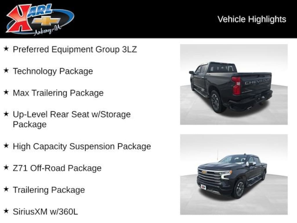 Recent Arrival! Certified. Local Trade & Sold New at Karls! Equipped With Running Boards, Hard-Folding Tonneau Cover & Rain Visors! Dark Ash Metallic 2023 Chevrolet Silverado 1500 High Country 4WD CREW CAB 147 HIGH COUNTRY EcoTec3 6.2L V8 10-Speed Automatic, 4WD, Jet Black Leather, 12.3 Multicolor Reconfigurable Digital Display, 15 Diagonal Multicolor Head-Up Display, 2 USB Data Ports, 2nd Row Heated Outboard Seats, Adaptive Cruise Control, Apple CarPlay/Android Auto, Auto High-beam Headlights, Auto-Dimming Inside Rear-View Mirror, Auto-Locking Rear Differential, Bed View Camera, Bluetooth® For Phone, Body-Color Painted Mirror Caps, Chevrolet Connected Access Capable, Chevytec Spray-On Black Bedliner, Chrome Assist Steps, Chrome Recovery Hooks, Color-Keyed Carpeting Floor Covering, Compass, Deep-Tinted Glass, Driver Memory, Dual Exhaust w/Polished Outlets, Dual Rear USB Ports (Charge Only), Electric Rear-Window Defogger, Electronic Cruise Control, Enhanced Cooling Radiator, Floor Mounted Center Console, Forward Collision Alert, Front Carpeted Floor Mats, Front dual zone A/C, Front LED Fog Lamps, Front Rainsensing Wipers, HD Surround Vision, Heated Driver & Front Outboard Passenger Seats, Heated Steering Wheel, Heavier Duty Rear Springs, Heavy-Duty Air Filter, High Capacity Suspension Package, Hill Descent Control, Hitch Guidance w/Hitch View, Increased RGAWR, Integrated Trailer Brake Controller, Keyless Open & Start, Lane Keep Assist w/Lane Departure Warning, LED Cargo Area Lighting, Max Trailering Package, Off-Road Suspension, OnStar & Chevrolet Connected Services Capable, Outside Heated Power-Adjustable Mirrors, Perimeter Lighting, Power driver seat, Power Sliding Rear Window w/Rear Defogger, Power Tailgate, Power Tilt & Telescoping Steering Column, Power windows, Preferred Equipment Group 3LZ, Premium Bose 7-Speaker Sound System, Rain sensing wipers, Rear Camera Mirror, Rear Carpeted Floor Mats, Rear Cross Traffic Alert-Braking, Rear Pedestrian Alert, Rear Wheelhouse Liners, Remote Vehicle Starter System, Safety Alert Seat, SiriusXM w/360L, Steering Wheel Audio Controls, Technology Package, Theft Deterrent System (Unauthorized Entry), Trailer Camera Provisions, Trailer Side Blind Zone Alert, Trailering App, Ultrasonic Front & Rear Park Assist, Universal Home Remote, Up-Level Rear Seat w/Storage Package, Ventilated Driver & Front Passenger Seats, Wheels: 20 x 9 Painted Aluminum, Wi-Fi Hot Spot Capable, Wireless Charging, Wireless Phone Projection, Wrapped Steering Wheel, Z71 Off-Road Package. 16/20 City/Highway MPG 10-Speed Automatic 4WDCertification Program Details: Karl Chevrolet of Ankeny, The Nation's #1 CarBravo certified dealer, where platinum quality vehicles and unmatched benefits come together! This vehicle qualifies for our CarBravo Certified program reserved for the highest-quality pre-owned vehicles that are 10 model years or newer and have less than 100,000 miles. Every CarBravo Certified vehicle includes: ? Comprehensive 126-Point Inspection Professionally inspected by factory-trained technicians to meet strict mechanical, safety, and cosmetic standards. ? 6-Month / 6,000-Mile Bumper-to-Bumper Limited Warranty Enjoy added peace of mind with extensive coverage from the day you drive off the lot. ? 24/7 Roadside Assistance & Courtesy Transportation Flat tire? Dead battery? Need a tow? You're covered anywhere, anytime throughout the warranty period. ? Vehicle History & Title Guarantee Clean title, completed safety recalls, and a full CARFAX® or AutoCheck® report provided for complete transparency. ? 10-Day / 500-Mile Exchange Promise If you don't absolutely love it, bring it back and exchange it no hassle, no stress. Experience peace of mind and premium protection exclusively from Karl Chevrolet of Ankeny, the Nation's #1 CarBravo Certified Dealer!