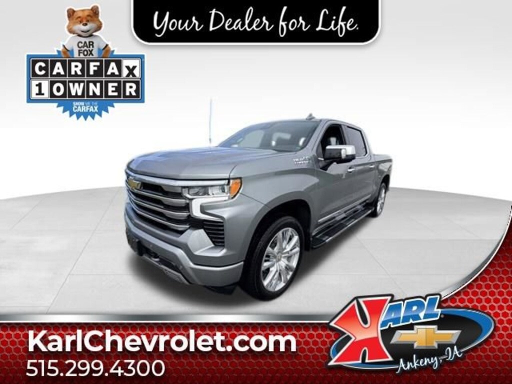 Recent Arrival! Clean CARFAX. Sterling Gray Metallic 2023 Chevrolet Silverado 1500 High Country EcoTec3 5.3L V8 10-Speed Automatic, 4WD, Black Leather. 16/20 City/Highway MPG 10-Speed Automatic 4WDAt Karl Chevrolet we want to help you find the best new or used car in Ankeny that suits your needs. Check out the 2023 Chevrolet Silverado 1500 For Sale in Ankeny, IA. When you buy a new car at Karl Chevrolet you know you're finding a vehicle you can rely on. We have a great selection of Platinum Quality Pre-Owned Vehicles. We also pride ourselves in creating a friendly atmosphere and reliable new car dealership that you can trust. Call us with any questions about our 2023 Chevrolet Silverado 1500 and our experts will be glad to help you! (515) 299-4300. *Equipment and options are generated by a 3rd party vendor, exact vehicle options may vary. Please see a salesperson for complete details and vehicle information.