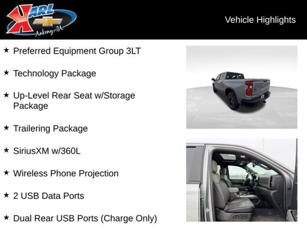 Certification Program Details: Karl Chevrolet of Ankeny, The Nation's #1 CarBravo Certified Dealer! Every CarBravo Certified vehicle includes: Comprehensive 126-Point Inspection Professionally inspected by factory-trained technicians to meet strict mechanical, safety, and cosmetic standards. 12-Month / 12,000-Mile Bumper-to-Bumper Limited Warranty Enjoy added peace of mind with extensive coverage from the day you drive off the lot. 24/7 Roadside Assistance & Courtesy Transportation Flat tire? Dead battery? Need a tow? You're covered anywhere, anytime throughout the warranty period. Vehicle History & Title Guarantee Clean title, completed safety recalls, and a full CARFAX® or AutoCheck® report provided for complete transparency. 10-Day / 500-Mile Exchange Promise If you don't absolutely love it, bring it back and exchange it no hassle, no stress. Experience peace of mind and premium protection exclusively from Karl Chevrolet of Ankeny, the Nation's #1 CarBravo Dealer! Technology Package Sunroof, Power Tailgate, Multi-Flex with six functional load/access featuresThis 2023 Chevrolet Silverado 1500 ZR2 4WD CREW CAB 147 ZR2 is a powerful and capable truck that's ready to take on any adventure. Equipped with a 6.2L EcoTec3 V8 engine and 10-speed automatic transmission, this Silverado delivers an impressive blend of performance and efficiency, with 14 city/17 highway MPG.The ZR2 trim level takes the Silverado's off-road capabilities to new heights, with features like an advanced 4WD system, high-performance Multimatic DSSV dampers, and an electronic locking rear differential. Whether you're tackling the toughest terrain or just need a reliable daily driver, this Silverado ZR2 is up for the challenge.Inside, you'll find a wealth of premium features, including a 12.3 reconfigurable digital instrument cluster, a 15 head-up display, and a Bose premium audio system. The heated and ventilated front seats, heated rear seats, and heated steering wheel ensure maximum comfort, while the wireless charging pad and Wi-Fi hotspot keep you connected on the go.This Silverado ZR2 also comes equipped with an impressive array of advanced safety and driver assistance technologies, including Adaptive Cruise Control, Forward Collision Alert, Lane Keep Assist, and Rear Pedestrian Alert. You can drive with confidence, knowing that you and your passengers are well-protected.Certified through Karl Chevrolet's CarBravo program, this Silverado ZR2 has been meticulously inspected and comes with a comprehensive 12-month/12,000-mile limited warranty, 24/7 roadside assistance, and a vehicle history report for complete transparency. Experience the unparalleled capability, technology, and peace of mind that this Silverado ZR2 has to offer.At Karl Chevrolet we want to help you find the best new or used car in Ankeny that suits your needs. When you buy a new car at Karl Chevrolet you know you're finding a vehicle you can rely on. We have a great selection of Platinum Quality Pre-Owned Vehicles. We also pride ourselves in creating a friendly atmosphere and a reliable Dealership that you can trust. Call us and our experts will be glad to help you! (515) 299-4300. *Equipment and options are generated by a 3rd party vendor, exact vehicle options may vary. Please see a salesperson for complete details and vehicle information.