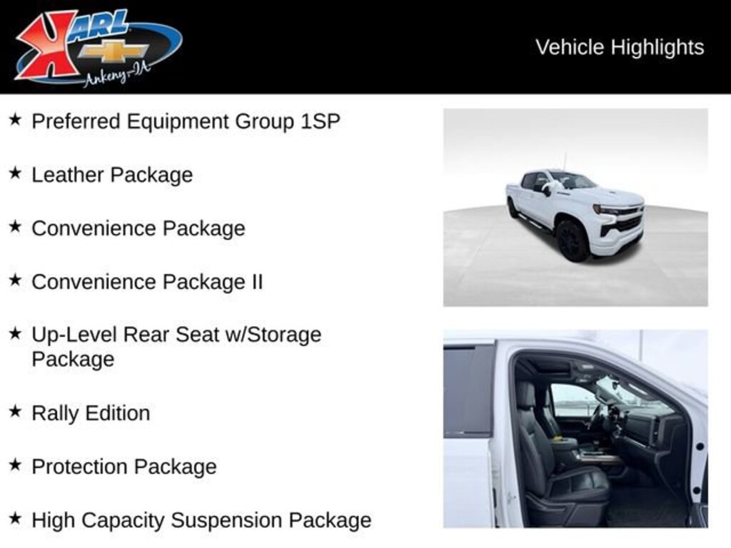 Recent Arrival! CARFAX One Owner, Local Trade & Sold New at Karls! Equipped With Running Boards & Tonneau Cover! Certified. Summit White 2023 Chevrolet Silverado 1500 RST 4WD CREW CAB 147 RS EcoTec3 6.2L V8 10-Speed Automatic, 4WD, Black Leather, 10-Way Power Driver Seat w/Lumbar, 12.3 Multicolor Reconfigurable Digital Display, 4 Black Round Assist Steps (LPO), 6-Speaker Audio System, All-Star Edition, Apple CarPlay/Android Auto, Auto High-beam Headlights, Auto-Locking Rear Differential, Bluetooth® For Phone, Chevrolet Connected Access Capable, Chevytec Spray-On Black Bedliner, Color-Keyed Carpeting Floor Covering, Compass, Convenience Package, Convenience Package II, Deep-Tinted Glass, Dual Exhaust w/Black Exhaust Tips, Dual Rear USB Ports (Charge Only), Dual-Zone Automatic Climate Control, Electric Rear-Window Defogger, Electronic Cruise Control, EZ Lift Power Lock & Release Tailgate, Forward Collision Alert, Front Frame-Mounted Black Recovery Hooks, Front LED Fog Lamps, Front Rubberized Vinyl Floor Mats, HD Rear Vision Camera, Heated Driver & Front Outboard Passenger Seats, Heated Power-Adjustable Outside Mirrors, Heated Steering Wheel, High Capacity Suspension Package, High Gloss Black Mirror Caps, Hitch Guidance w/Hitch View, Inside Rear-View Mirror w/Tilt, Integrated Trailer Brake Controller, Keyless Open & Start, Leather Package, Leather-Appointed Front Seat Trim, LED Cargo Area Lighting, OnStar & Chevrolet Connected Services Capable, Power driver seat, Power Sliding Rear Window w/Rear Defogger, Power Sunroof, Power windows, Preferred Equipment Group 1SP, Premium Bose 7-Speaker Sound System, Protection Package, Rally Edition, Rear 60/40 Folding Bench Seat (Folds Up), Rear Rubberized-Vinyl Floor Mats, Rear Wheelhouse Liners, Remote Vehicle Starter System, SiriusXM w/360L, Standard Suspension Package, Standard Tailgate, Steering Wheel Audio Controls, Theft Deterrent System (Unauthorized Entry), Trailering App, Trailering Package, Universal Home Remote, Up-Level Rear Seat w/Storage Package, Wheels: 20 x 9 High Gloss Black Painted Alum, Wi-Fi Hot Spot Capable, Wireless Phone Projection, Wrapped Steering Wheel. 16/20 City/Highway MPG 10-Speed Automatic 4WDCertification Program Details: Karl Chevrolet of Ankeny, The Nation's #1 CarBravo certified dealer, where platinum quality vehicles and unmatched benefits come together! This vehicle qualifies for our CarBravo Certified program reserved for the highest-quality pre-owned vehicles that are 10 model years or newer and have less than 100,000 miles. Every CarBravo Certified vehicle includes: ? Comprehensive 126-Point Inspection Professionally inspected by factory-trained technicians to meet strict mechanical, safety, and cosmetic standards. ? 6-Month / 6,000-Mile Bumper-to-Bumper Limited Warranty Enjoy added peace of mind with extensive coverage from the day you drive off the lot. ? 24/7 Roadside Assistance & Courtesy Transportation Flat tire? Dead battery? Need a tow? You're covered anywhere, anytime throughout the warranty period. ? Vehicle History & Title Guarantee Clean title, completed safety recalls, and a full CARFAX® or AutoCheck® report provided for complete transparency. ? 10-Day / 500-Mile Exchange Promise If you don't absolutely love it, bring it back and exchange it no hassle, no stress. Experience peace of mind and premium protection exclusively from Karl Chevrolet of Ankeny, the Nation's #1 CarBravo Certified Deale
